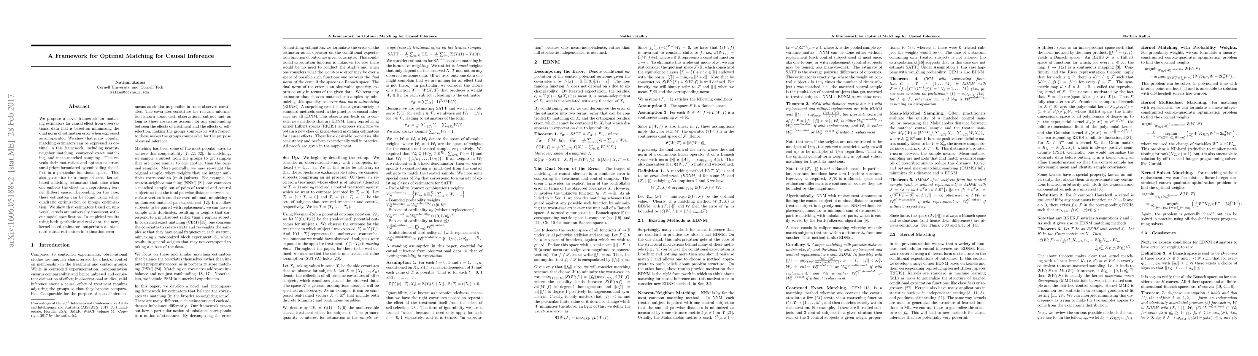 We propose a novel framework for matching estimators for causal effect from observational data that is based on minimizing the dual norm of estimation error when expressed as an operator. We show that many popular matching estimators can be expressed as optimal in this framework, including nearest-neighbor matching, coarsened exact matching, and mean-matched sampling. This reveals their motivation and aptness as structural priors formulated by embedding the effect in a particular functional space. This also gives rise to a range of new, kernel-based matching estimators that arise when one embeds the effect in a reproducing kernel Hilbert space. Depending on the case, these estimators can be found using either quadratic optimization or integer optimization. We show that estimators based on universal kernels are universally consistent without model specification. In empirical results using both synthetic and real data, the new, kernel-based estimators outperform all standard causal estimators in estimation error.