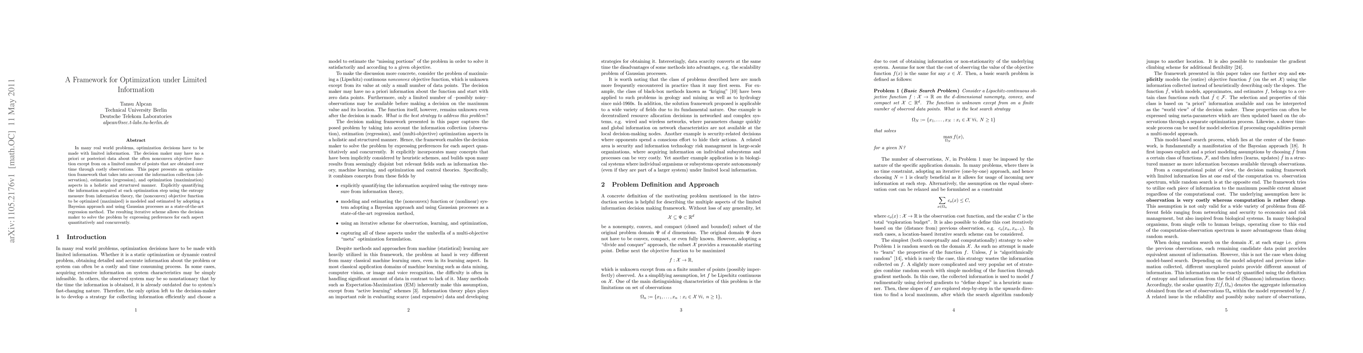 In many real world problems, optimization decisions have to be made with limited information. The decision maker may have no a priori or posteriori data about the often nonconvex objective function except from on a limited number of points that are obtained over time through costly observations. This paper presents an optimization framework that takes into account the information collection (observation), estimation (regression), and optimization (maximization) aspects in a holistic and structured manner. Explicitly quantifying the information acquired at each optimization step using the entropy measure from information theory, the (nonconvex) objective function to be optimized (maximized) is modeled and estimated by adopting a Bayesian approach and using Gaussian processes as a state-of-the-art regression method. The resulting iterative scheme allows the decision maker to solve the problem by expressing preferences for each aspect quantitatively and concurrently.