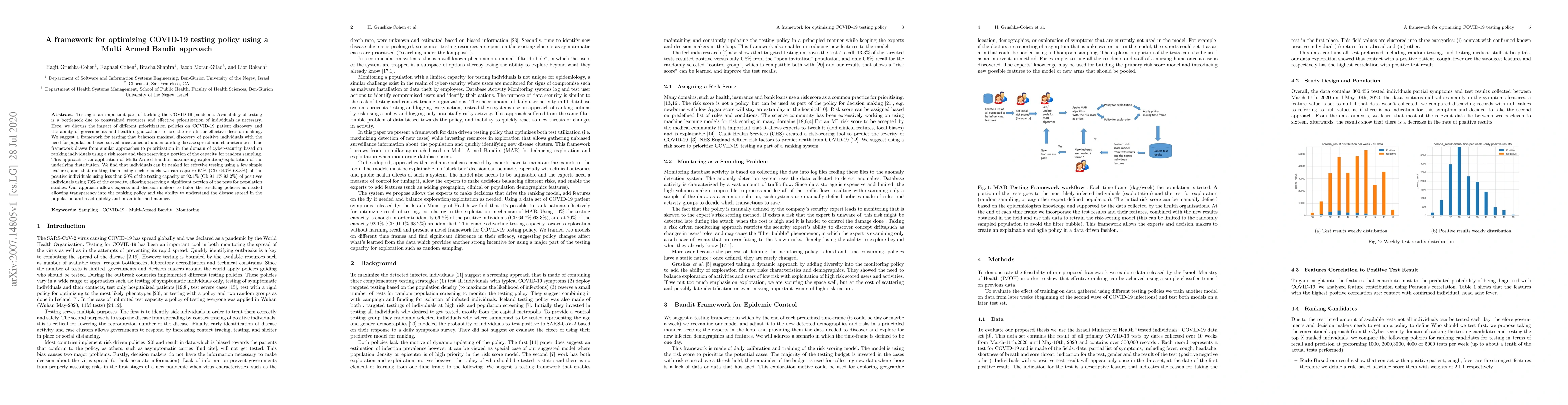 Testing is an important part of tackling the COVID-19 pandemic. Availability of testing is a bottleneck due to constrained resources and effective prioritization of individuals is necessary. Here, we discuss the impact of different prioritization policies on COVID-19 patient discovery and the ability of governments and health organizations to use the results for effective decision making. We suggest a framework for testing that balances the maximal discovery of positive individuals with the need for population-based surveillance aimed at understanding disease spread and characteristics. This framework draws from similar approaches to prioritization in the domain of cyber-security based on ranking individuals using a risk score and then reserving a portion of the capacity for random sampling. This approach is an application of Multi-Armed-Bandits maximizing exploration/exploitation of the underlying distribution. We find that individuals can be ranked for effective testing using a few simple features, and that ranking them using such models we can capture 65% (CI: 64.7%-68.3%) of the positive individuals using less than 20% of the testing capacity or 92.1% (CI: 91.1%-93.2%) of positives individuals using 70% of the capacity, allowing reserving a significant portion of the tests for population studies. Our approach allows experts and decision-makers to tailor the resulting policies as needed allowing transparency into the ranking policy and the ability to understand the disease spread in the population and react quickly and in an informed manner.