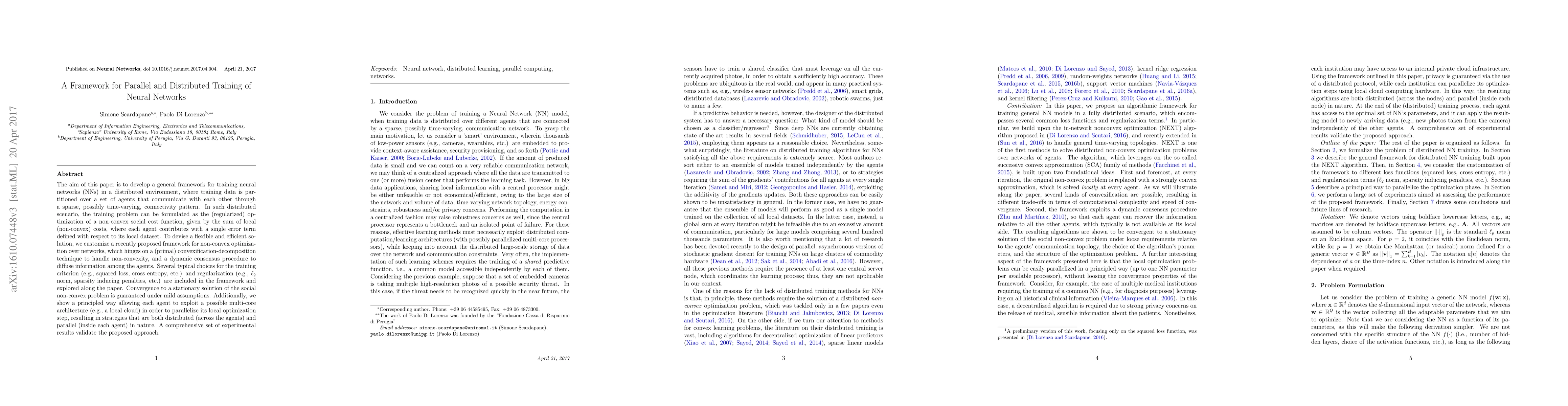 The aim of this paper is to develop a general framework for training neural networks (NNs) in a distributed environment, where training data is partitioned over a set of agents that communicate with each other through a sparse, possibly time-varying, connectivity pattern. In such distributed scenario, the training problem can be formulated as the (regularized) optimization of a non-convex social cost function, given by the sum of local (non-convex) costs, where each agent contributes with a single error term defined with respect to its local dataset. To devise a flexible and efficient solution, we customize a recently proposed framework for non-convex optimization over networks, which hinges on a (primal) convexification-decomposition technique to handle non-convexity, and a dynamic consensus procedure to diffuse information among the agents. Several typical choices for the training criterion (e.g., squared loss, cross entropy, etc.) and regularization (e.g., $\ell_2$ norm, sparsity inducing penalties, etc.) are included in the framework and explored along the paper. Convergence to a stationary solution of the social non-convex problem is guaranteed under mild assumptions. Additionally, we show a principled way allowing each agent to exploit a possible multi-core architecture (e.g., a local cloud) in order to parallelize its local optimization step, resulting in strategies that are both distributed (across the agents) and parallel (inside each agent) in nature. A comprehensive set of experimental results validate the proposed approach.