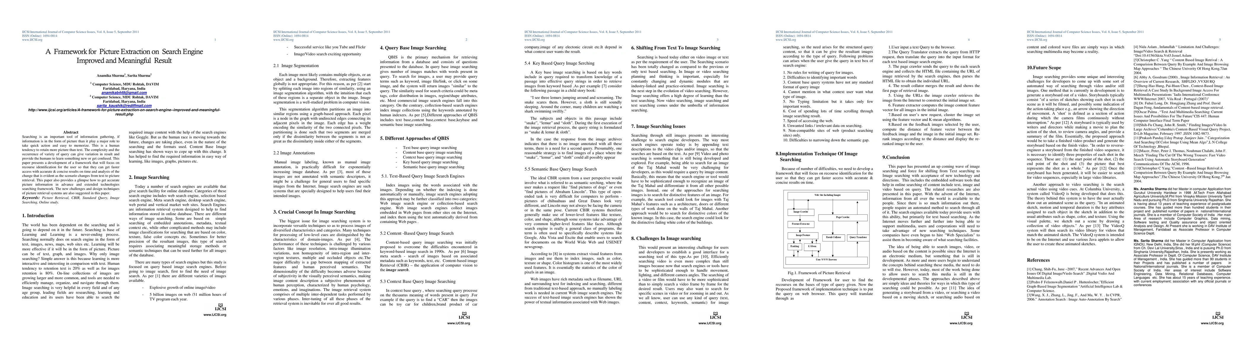 Searching is an important tool of information gathering, if information is in the form of picture than it play a major role to take quick action and easy to memorize. This is a human tendency to retain more picture than text. The complexity and the occurrence of variety of query can give variation in result and provide the humans to learn something new or get confused. This paper presents a development of a framework that will focus on recourse identification for the user so that they can get faster access with accurate & concise results on time and analysis of the change that is evident as the scenario changes from text to picture retrieval. This paper also provides a glimpse how to get accurate picture information in advance and extended technologies searching framework. The new challenges and design techniques of picture retrieval systems are also suggested in this paper.