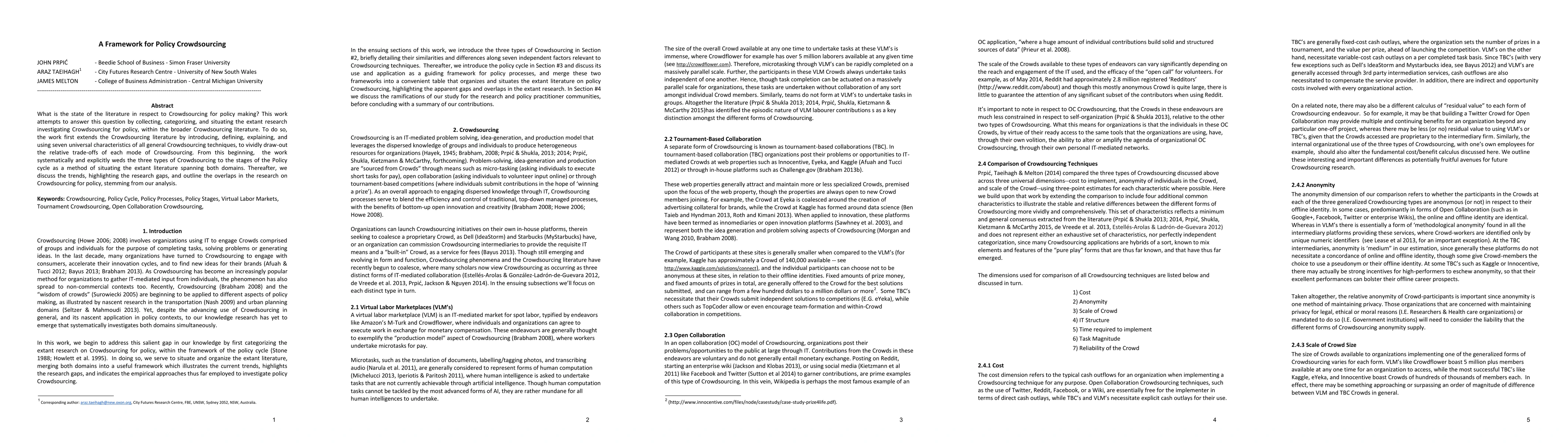 This paper categorizes and situates existing research on Crowdsourcing for policymaking within the broader Crowdsourcing literature, introducing seven universal characteristics to highlight trade-offs. It systematically aligns different Crowdsourcing types with stages of the Policy cycle, identifying trends, research gaps, and overlaps.