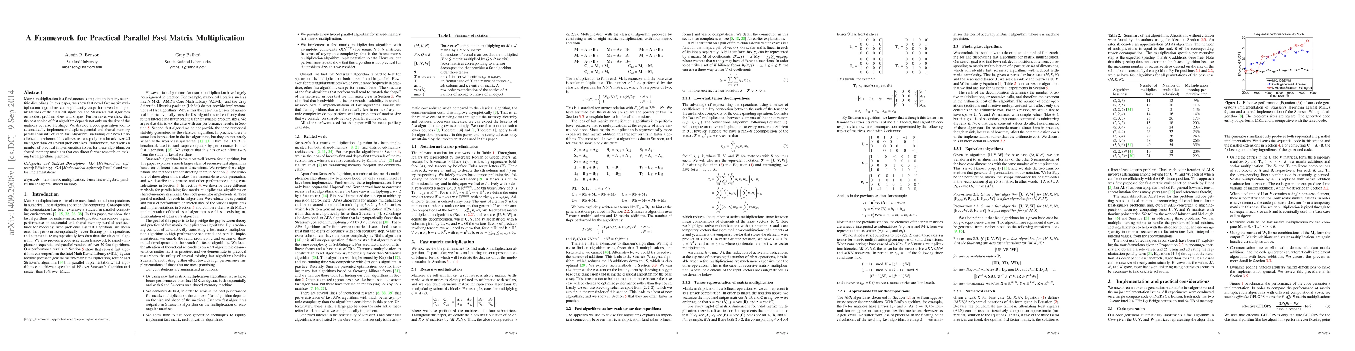 This paper introduces novel fast matrix multiplication algorithms that outperform traditional methods on modest problem sizes and shapes. It also presents a code generation tool for implementing various parallel variants, enabling benchmarking of over 20 algorithms, and discusses practical implementation issues for shared-memory machines.