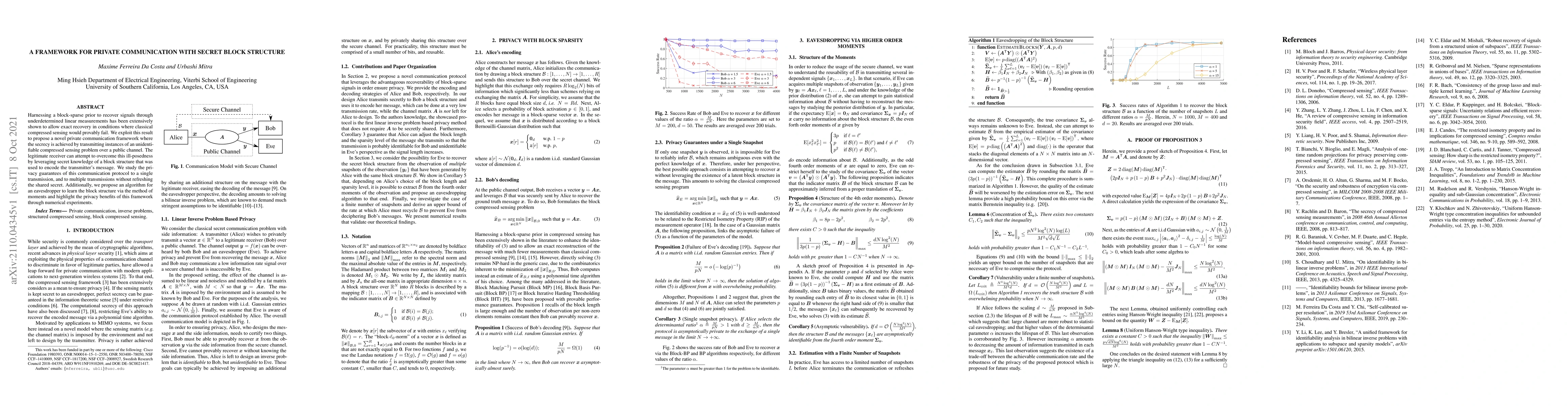 Researchers propose a secure communication framework using block-sparse priors to encode messages, enabling private transmission over public channels. The proposed protocol provides privacy guarantees for single transmissions and multiple transmissions without refreshing the shared secret.