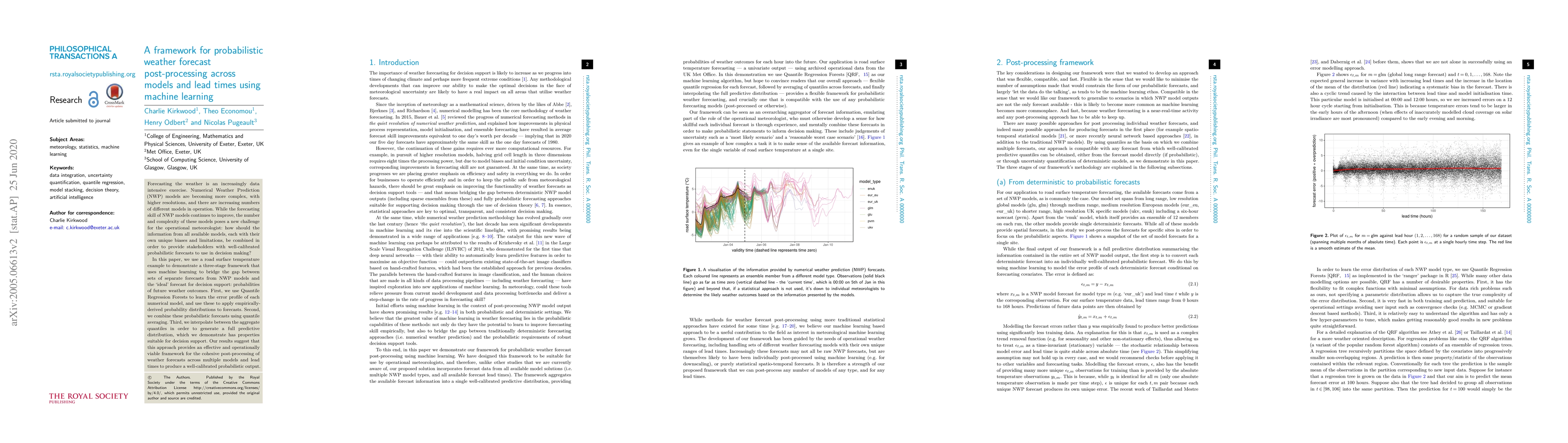 This paper presents a machine learning framework for post-processing probabilistic weather forecasts from multiple numerical models to produce well-calibrated forecasts. It uses Quantile Regression Forests to correct individual model biases, combines forecasts via quantile averaging, and interpolates to generate a full predictive distribution suitable for decision support.