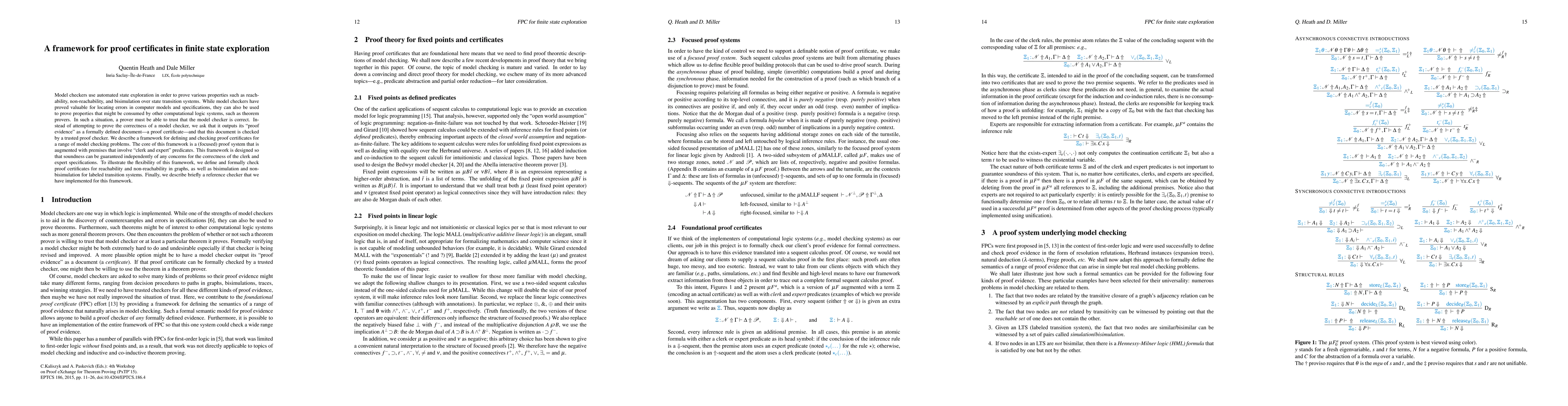 Model checkers use automated state exploration in order to prove various properties such as reachability, non-reachability, and bisimulation over state transition systems. While model checkers have proved valuable for locating errors in computer models and specifications, they can also be used to prove properties that might be consumed by other computational logic systems, such as theorem provers. In such a situation, a prover must be able to trust that the model checker is correct. Instead of attempting to prove the correctness of a model checker, we ask that it outputs its "proof evidence" as a formally defined document--a proof certificate--and that this document is checked by a trusted proof checker. We describe a framework for defining and checking proof certificates for a range of model checking problems. The core of this framework is a (focused) proof system that is augmented with premises that involve "clerk and expert" predicates. This framework is designed so that soundness can be guaranteed independently of any concerns for the correctness of the clerk and expert specifications. To illustrate the flexibility of this framework, we define and formally check proof certificates for reachability and non-reachability in graphs, as well as bisimulation and non-bisimulation for labeled transition systems. Finally, we describe briefly a reference checker that we have implemented for this framework.