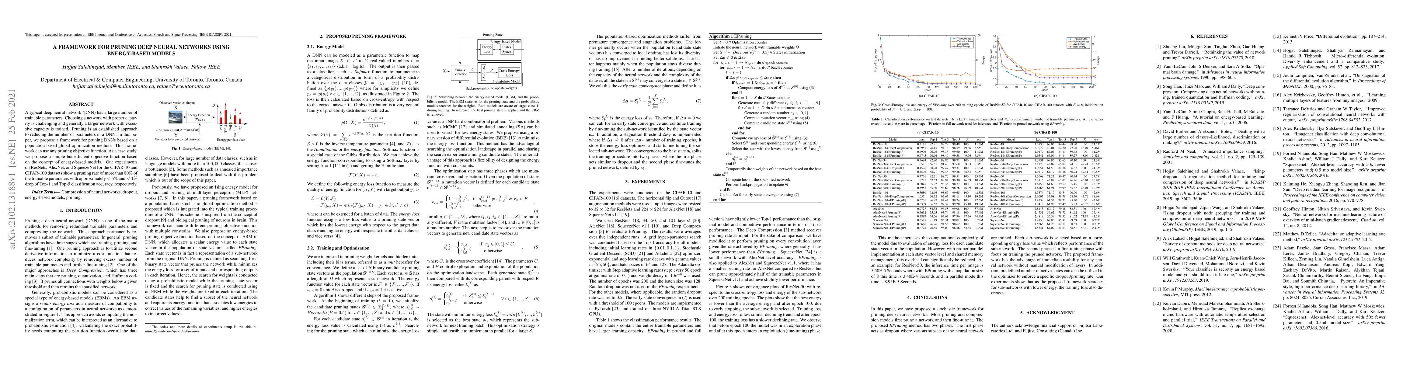 This paper proposes a framework for pruning deep neural networks using a population-based global optimization method and an energy-based model objective function. Experiments on ResNets, AlexNet, and SqueezeNet show over 50% parameter reduction with minimal loss in classification accuracy.