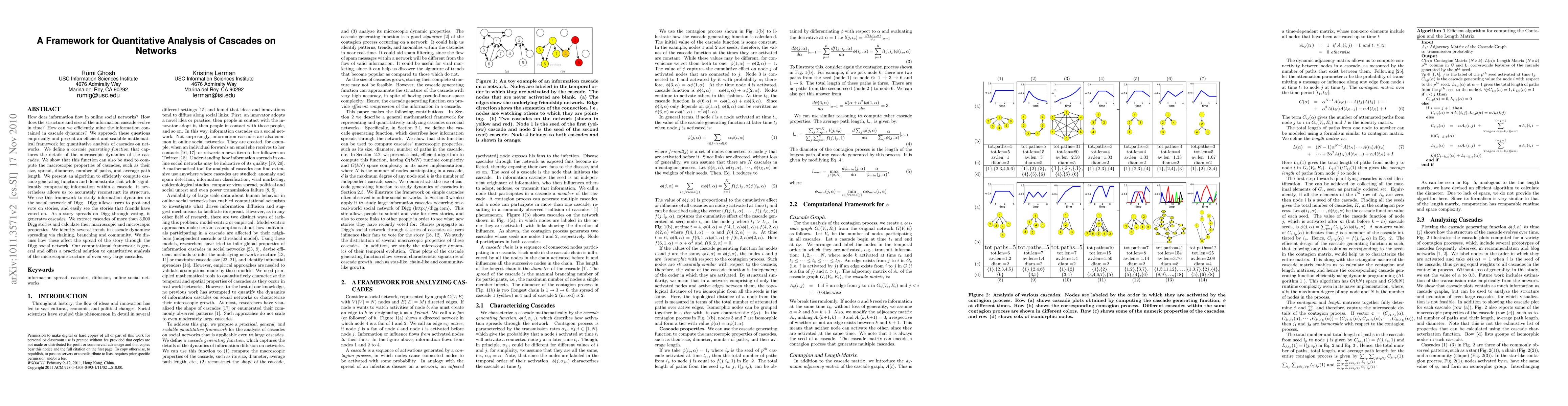 This paper presents a mathematical framework to analyze information cascades in online social networks like Digg. The framework, based on a cascade generating function, efficiently computes both microscopic and macroscopic cascade properties. It reveals trends such as chaining, branching, and community-driven spreading, offering insights into information dissemination patterns across large networks.