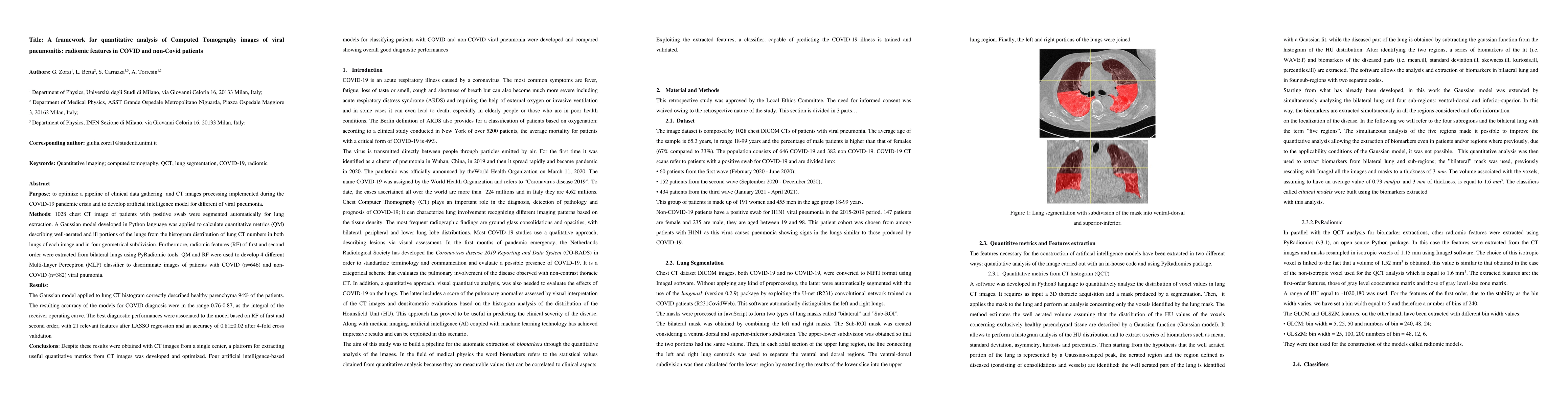 Purpose: to optimize a pipeline of clinical data gathering and CT images processing implemented during the COVID-19 pandemic crisis and to develop artificial intelligence model for different of viral pneumonia. Methods: 1028 chest CT image of patients with positive swab were segmented automatically for lung extraction. A Gaussian model developed in Python language was applied to calculate quantitative metrics (QM) describing well-aerated and ill portions of the lungs from the histogram distribution of lung CT numbers in both lungs of each image and in four geometrical subdivision. Furthermore, radiomic features (RF) of first and second order were extracted from bilateral lungs using PyRadiomic tools. QM and RF were used to develop 4 different Multi-Layer Perceptron (MLP) classifier to discriminate images of patients with COVID (n=646) and non-COVID (n=382) viral pneumonia. Results: The Gaussian model applied to lung CT histogram correctly described healthy parenchyma 94% of the patients. The resulting accuracy of the models for COVID diagnosis were in the range 0.76-0.87, as the integral of the receiver operating curve. The best diagnostic performances were associated to the model based on RF of first and second order, with 21 relevant features after LASSO regression and an accuracy of 0.81$\pm$0.02 after 4-fold cross validation Conclusions: Despite these results were obtained with CT images from a single center, a platform for extracting useful quantitative metrics from CT images was developed and optimized. Four artificial intelligence-based models for classifying patients with COVID and non-COVID viral pneumonia were developed and compared showing overall good diagnostic performances