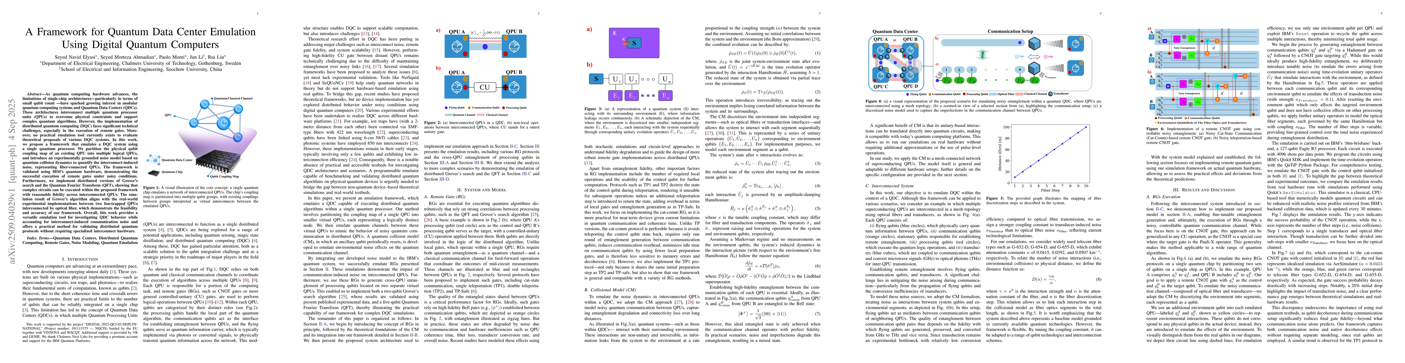 As quantum computing hardware advances, the limitations of single-chip architectures, particularly in terms of small qubit count, have sparked growing interest in modular quantum computing systems and Quantum Data Centers (QDCs). These architectures interconnect multiple quantum processor units (QPUs) to overcome physical constraints and support complex quantum algorithms. However, the implementation of distributed quantum computing (DQC) faces significant technical challenges, especially in the execution of remote gates. Moreover, no practical emulation tool currently exists to evaluate theoretical proposals of various DQC systems. In this work, we propose a framework that emulates a DQC system using a single quantum processor. We partition the physical qubit coupling map of an existing QPU into multiple logical QPUs, and introduce an experimentally grounded noise model based on quantum collision dynamics to quantify the interconnect-induced noise, representing fiber-connected QPUs. The framework is validated using IBM's quantum hardware, demonstrating the successful execution of remote gates under noisy conditions. Furthermore, we implement distributed versions of Grover's search and the Quantum Fourier Transform (QFT), showing that complex circuits can be executed within the proposed framework with reasonable fidelity across interconnected QPUs. The emulation result of Grover's algorithm aligns with the real-world experimental implementations between two Ion-trapped QPUs interconnected by optical fiber, which demonstrate the feasibility and accuracy of our framework. Overall, this work provides a versatile emulation tool for investigating QDC behavior while accounting for interconnect-induced communication noise and offers a practical method for validating distributed quantum protocols without requiring specialized interconnect hardware.