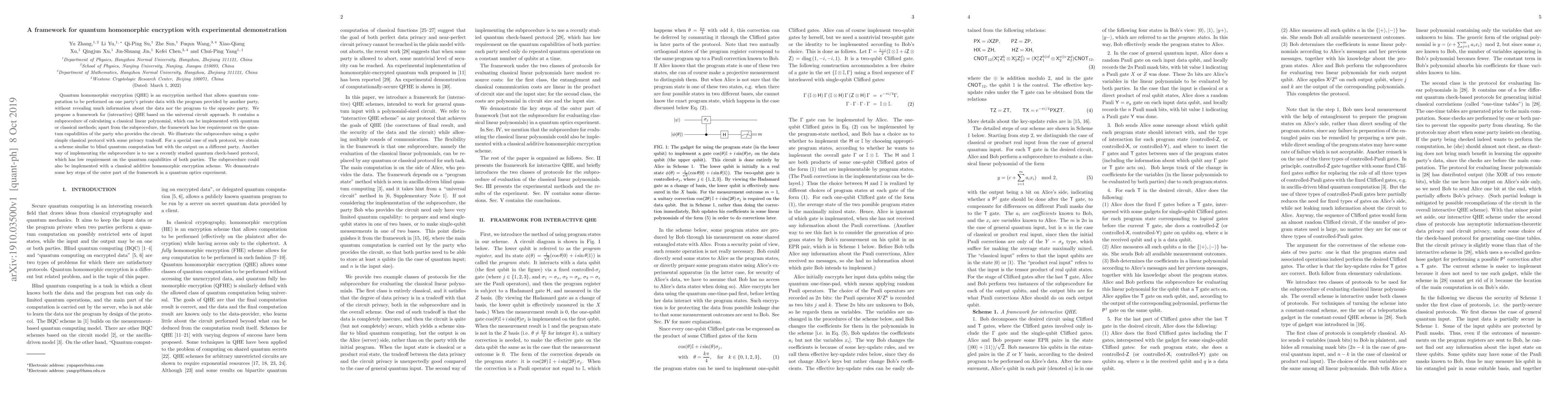 This paper proposes a framework for quantum homomorphic encryption (QHE) that allows computations on encrypted data without revealing the data or program, using a universal circuit approach. The framework includes a low-quantum-requirement subprocedure and is demonstrated experimentally in quantum optics.
