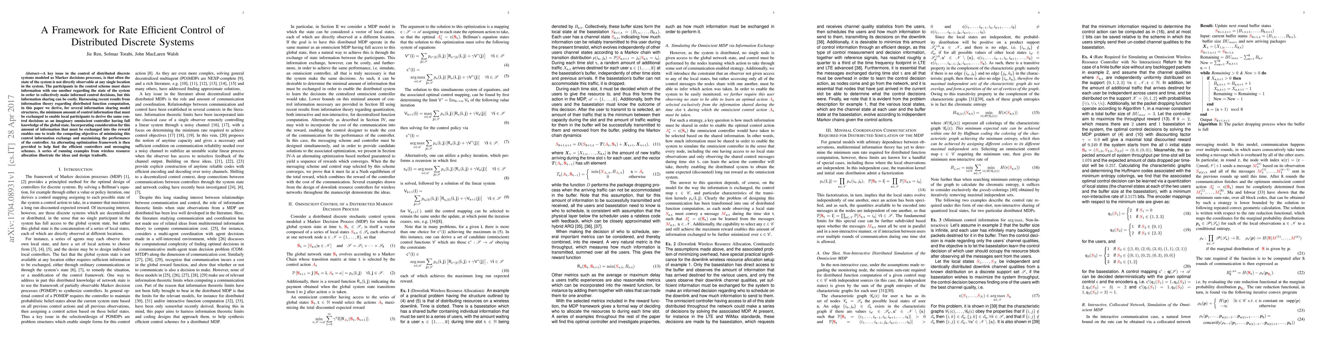 A key issue in the control of distributed discrete systems modeled as Markov decisions processes, is that often the state of the system is not directly observable at any single location in the system. The participants in the control scheme must share information with one another regarding the state of the system in order to collectively make informed control decisions, but this information sharing can be costly. Harnessing recent results from information theory regarding distributed function computation, in this paper we derive, for several information sharing model structures, the minimum amount of control information that must be exchanged to enable local participants to derive the same control decisions as an imaginary omniscient controller having full knowledge of the global state. Incorporating consideration for this amount of information that must be exchanged into the reward enables one to trade the competing objectives of minimizing this control information exchange and maximizing the performance of the controller. An alternating optimization framework is then provided to help find the efficient controllers and messaging schemes. A series of running examples from wireless resource allocation illustrate the ideas and design tradeoffs.