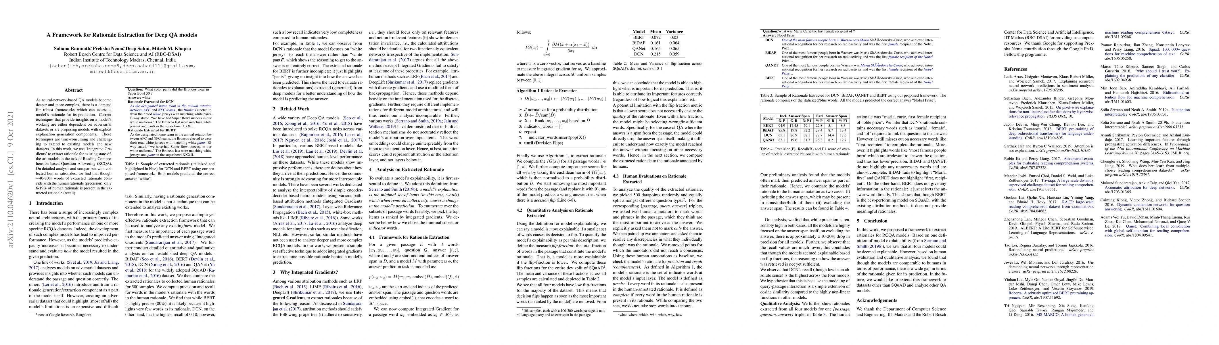 This paper proposes a framework using Integrated Gradients to extract rationales from deep QA models for Reading Comprehension. While the extracted rationales show high precision (~40-80% word overlap), recall remains low (6-19%), indicating room for improvement in aligning model explanations with human rationales.