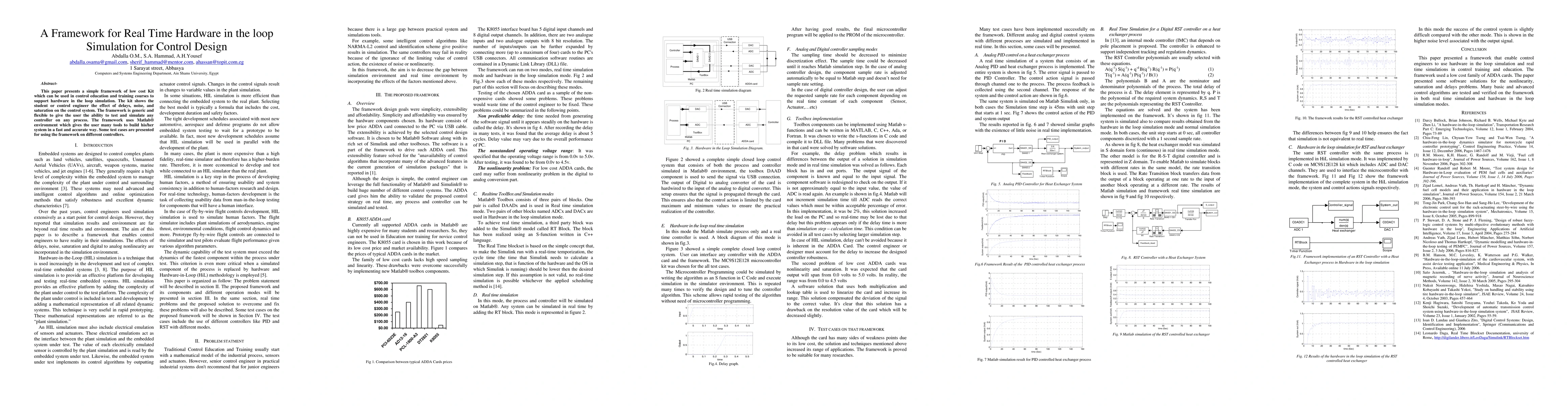 This paper presents a simple framework of low cost Kit which can be used in control education and training courses to support hardware in the loop simulation. The kit shows the student or control engineer the effect of delays, noise, and saturation on the control system. The framework is generic and flexible to give the user the ability to test and simulate any controller on any process. The framework uses Matlab environment which gives the user many tools to build is/her system in a fast and accurate way. Some test cases are presented for using the framework on different controllers.