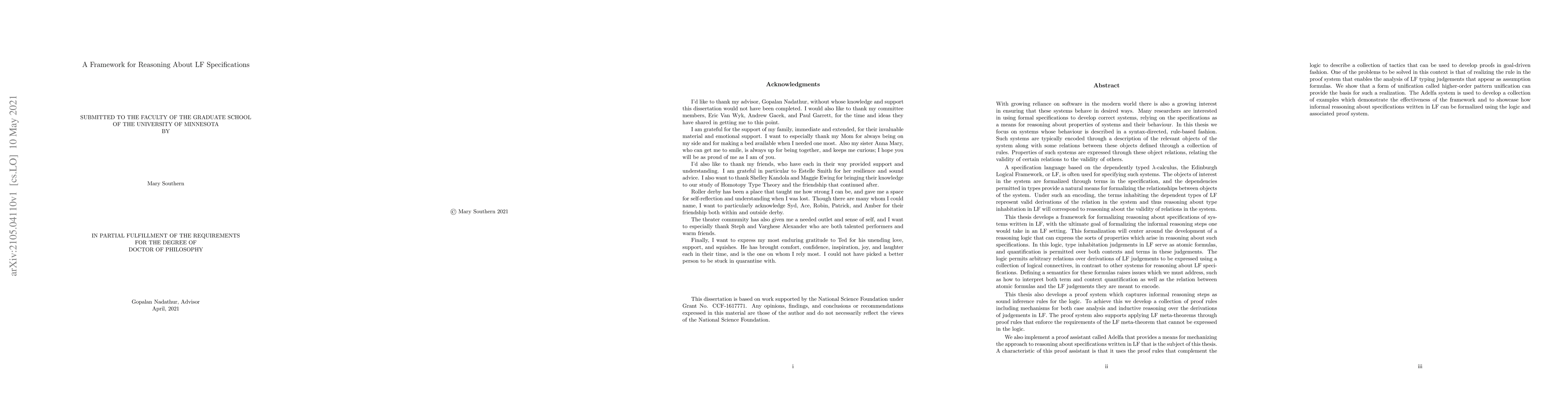 This thesis develops a framework for formalizing reasoning about specifications of systems written in LF. This formalization centers around the development of a reasoning logic that can express the sorts of properties which arise in reasoning about such specifications. In this logic, type inhabitation judgements in LF serve as atomic formulas, and quantification is permitted over both contexts and terms in these judgements. The logic permits arbitrary relations over derivations of LF judgements to be expressed using a collection of logical connectives, in contrast to other systems for reasoning about LF specifications. Defining a semantics for these formulas raises issues which we must address, such as how to interpret both term and context quantification as well as the relation between atomic formulas and the LF judgements they are meant to encode. This thesis also develops a proof system which captures informal reasoning steps as sound inference rules for the logic. To achieve this we develop a collection of proof rules including mechanisms for both case analysis and inductive reasoning over the derivations of judgements in LF. The proof system also supports applying LF meta-theorems through proof rules that enforce requirements of the LF meta-theorem that cannot be expressed in the logic. We also implement a proof assistant called Adelfa that provides a means for mechanizing this approach to reasoning about specifications written in LF. A characteristic of this proof assistant is that it uses the proof rules that complement the logic to describe a collection of tactics that are used to develop proofs in goal-driven fashion. The Adelfa system is used to develop a collection of examples which demonstrate the effectiveness of the framework and showcase how informal reasoning about specifications written in LF can be formalized using the logic and associated proof system.