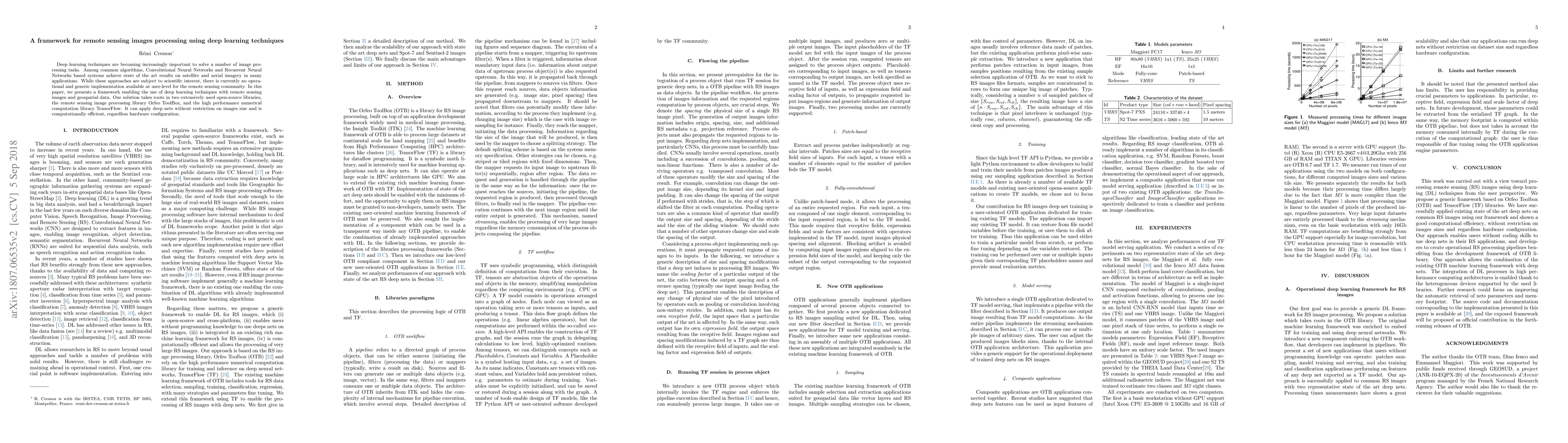 This paper introduces a framework leveraging deep learning, specifically Convolutional Neural Networks and Recurrent Neural Networks, to process remote sensing images. It combines the Orfeo ToolBox for image processing and TensorFlow for computational efficiency, offering a user-friendly solution for remote sensing applications.