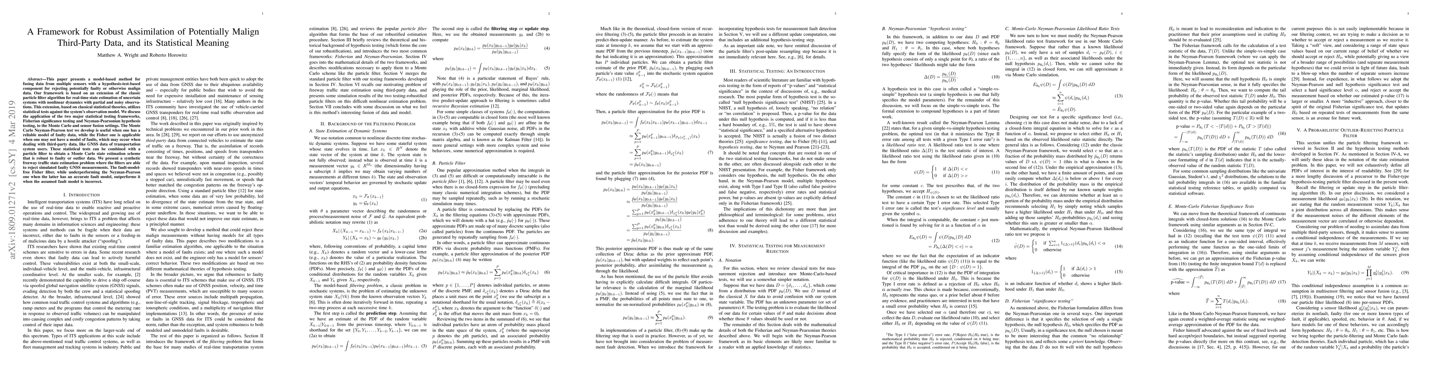 This paper presents a model-based method for fusing data from multiple sensors with a hypothesis-test-based component for rejecting potentially faulty or otherwise malign data. Our framework is based on an extension of the classic particle filter algorithm for real-time state estimation of uncertain systems with nonlinear dynamics with partial and noisy observations. This extension, based on classical statistical theories, utilizes statistical tests against the system's observation model. We discuss the application of the two major statistical testing frameworks, Fisherian significance testing and Neyman-Pearsonian hypothesis testing, to the Monte Carlo and sensor fusion settings. The Monte Carlo Neyman-Pearson test we develop is useful when one has a reliable model of faulty data, while the Fisher one is applicable when one may not have a model of faults, which may occur when dealing with third-party data, like GNSS data of transportation system users. These statistical tests can be combined with a particle filter to obtain a Monte Carlo state estimation scheme that is robust to faulty or outlier data. We present a synthetic freeway traffic state estimation problem where the filters are able to reject simulated faulty GNSS measurements. The fault-model-free Fisher filter, while underperforming the Neyman-Pearson one when the latter has an accurate fault model, outperforms it when the assumed fault model is incorrect.