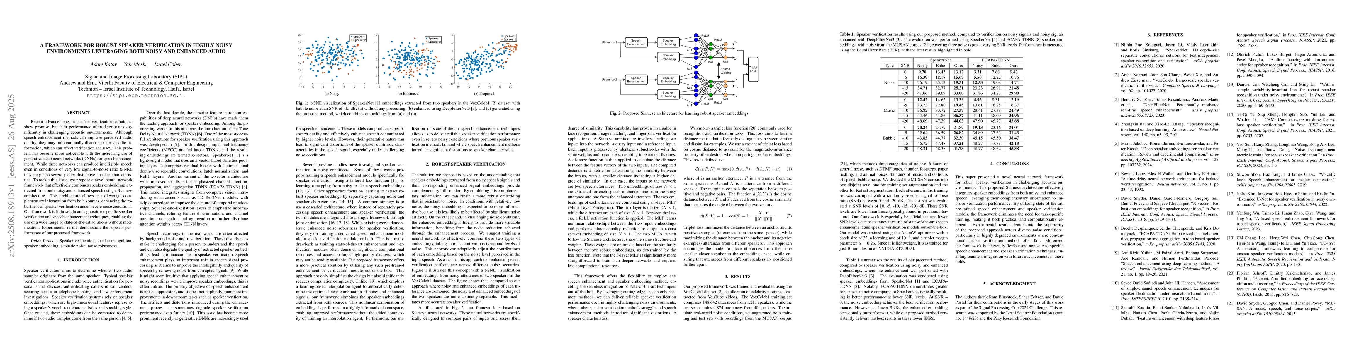 Recent advancements in speaker verification techniques show promise, but their performance often deteriorates significantly in challenging acoustic environments. Although speech enhancement methods can improve perceived audio quality, they may unintentionally distort speaker-specific information, which can affect verification accuracy. This problem has become more noticeable with the increasing use of generative deep neural networks (DNNs) for speech enhancement. While these networks can produce intelligible speech even in conditions of very low signal-to-noise ratio (SNR), they may also severely alter distinctive speaker characteristics. To tackle this issue, we propose a novel neural network framework that effectively combines speaker embeddings extracted from both noisy and enhanced speech using a Siamese architecture. This architecture allows us to leverage complementary information from both sources, enhancing the robustness of speaker verification under severe noise conditions. Our framework is lightweight and agnostic to specific speaker verification and speech enhancement techniques, enabling the use of a wide range of state-of-the-art solutions without modification. Experimental results demonstrate the superior performance of our proposed framework.
