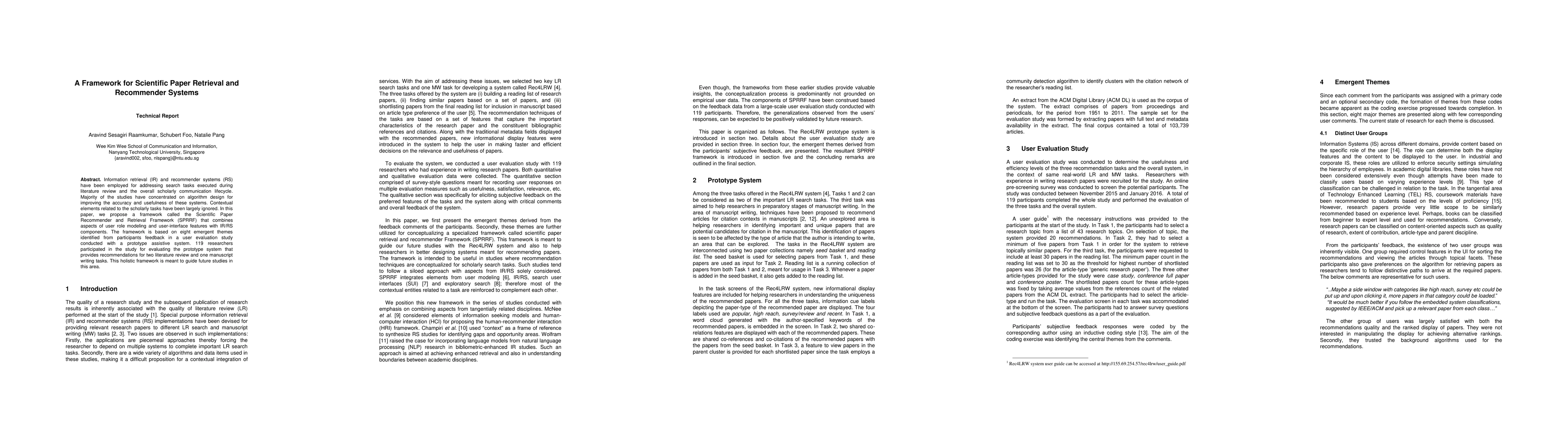 This paper proposes the Scientific Paper Recommender and Retrieval Framework (SPRRF), integrating user role modeling and interface features with information retrieval and recommender systems to enhance scholarly communication. The framework was developed based on feedback from 119 researchers evaluating a prototype system for literature review and manuscript writing tasks.