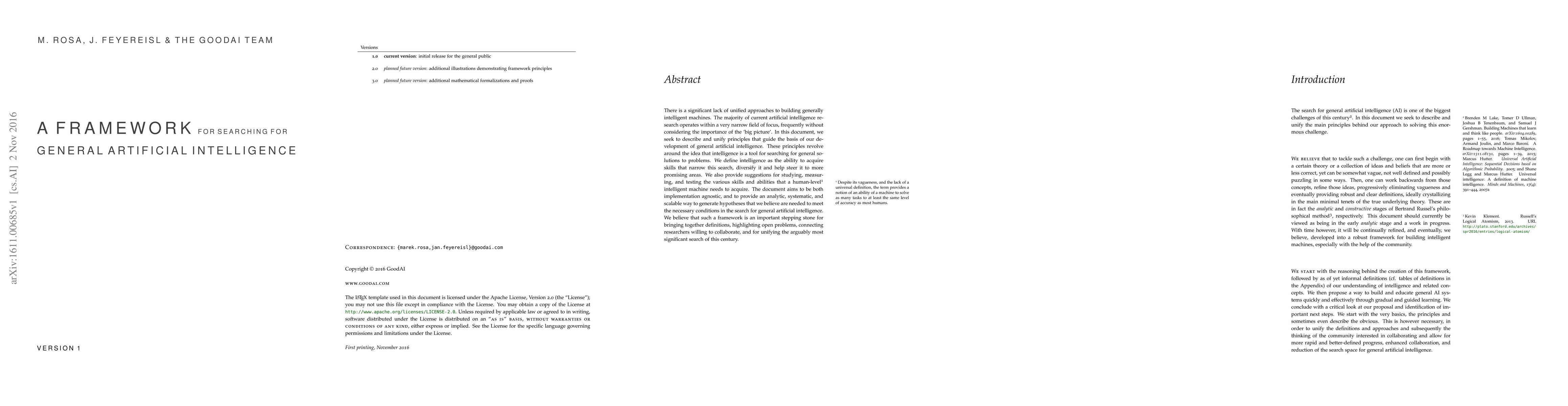 There is a significant lack of unified approaches to building generally intelligent machines. The majority of current artificial intelligence research operates within a very narrow field of focus, frequently without considering the importance of the 'big picture'. In this document, we seek to describe and unify principles that guide the basis of our development of general artificial intelligence. These principles revolve around the idea that intelligence is a tool for searching for general solutions to problems. We define intelligence as the ability to acquire skills that narrow this search, diversify it and help steer it to more promising areas. We also provide suggestions for studying, measuring, and testing the various skills and abilities that a human-level intelligent machine needs to acquire. The document aims to be both implementation agnostic, and to provide an analytic, systematic, and scalable way to generate hypotheses that we believe are needed to meet the necessary conditions in the search for general artificial intelligence. We believe that such a framework is an important stepping stone for bringing together definitions, highlighting open problems, connecting researchers willing to collaborate, and for unifying the arguably most significant search of this century.