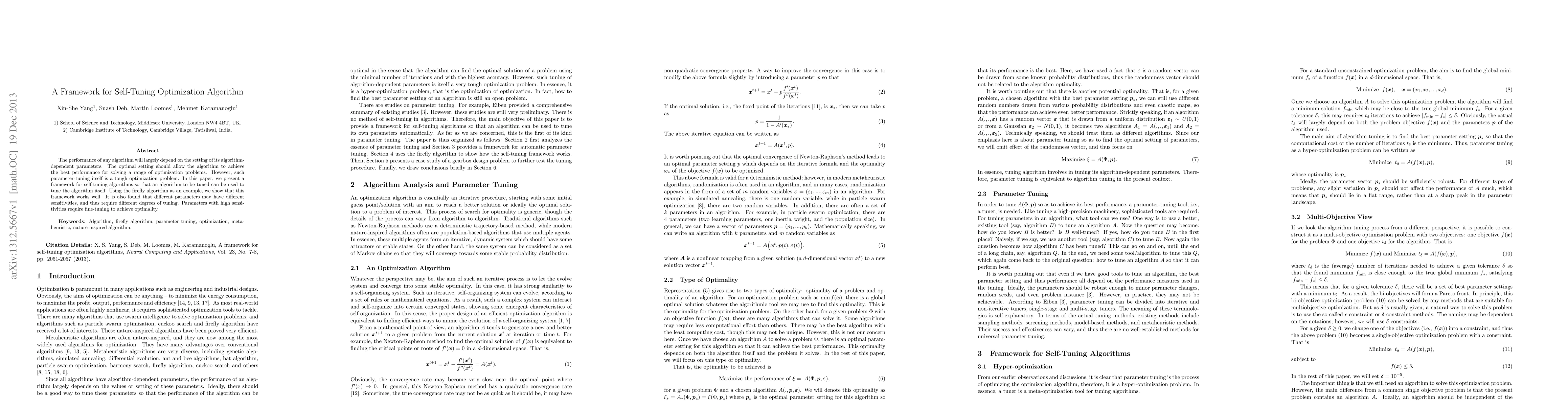 This paper introduces a framework for self-tuning optimization algorithms, enabling an algorithm to optimize its own parameters. Using the firefly algorithm as an example, the authors demonstrate the framework's effectiveness and highlight that different parameters require varying degrees of tuning based on their sensitivity.