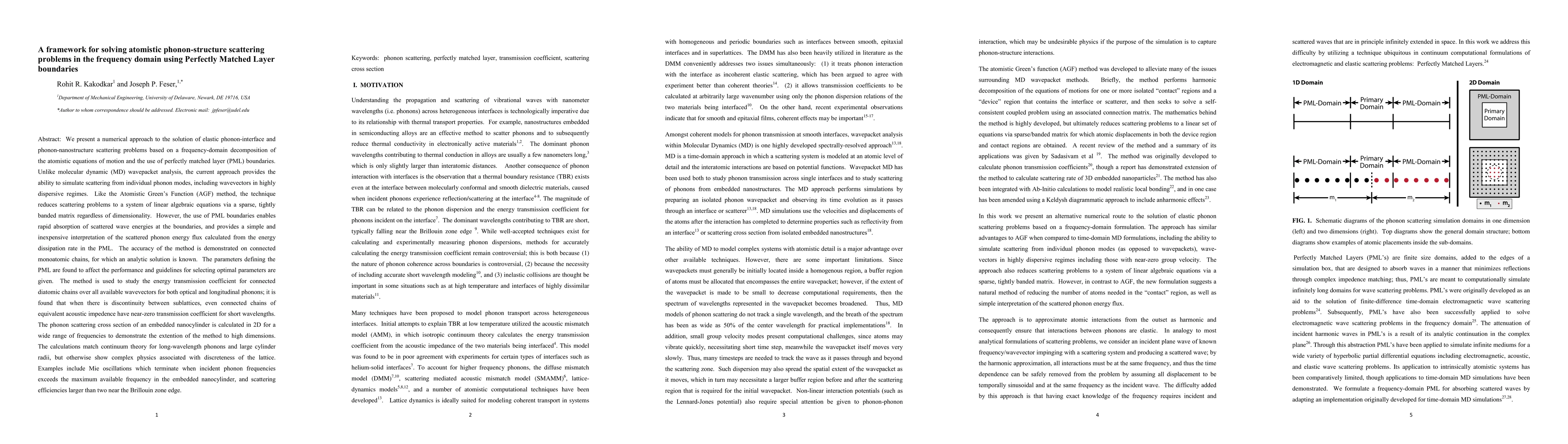 This paper introduces a numerical framework for solving atomistic phonon-structure scattering problems using frequency domain decomposition and Perfectly Matched Layer (PML) boundaries. The method efficiently simulates scattering from individual phonon modes and demonstrates accurate energy transmission coefficients and scattering cross sections for various phonon configurations.