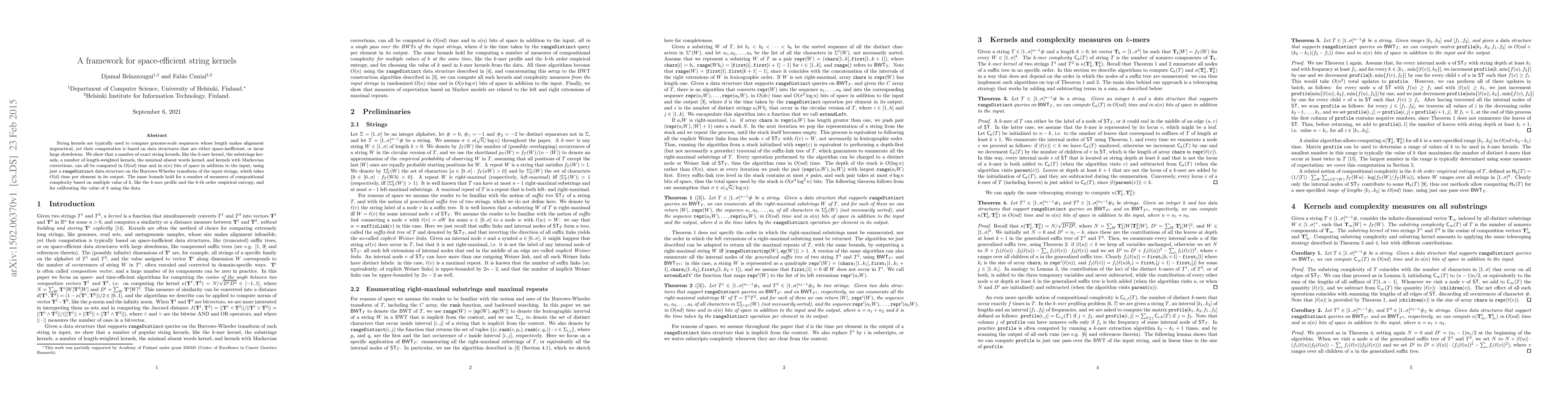String kernels are typically used to compare genome-scale sequences whose length makes alignment impractical, yet their computation is based on data structures that are either space-inefficient, or incur large slowdowns. We show that a number of exact string kernels, like the $k$-mer kernel, the substrings kernels, a number of length-weighted kernels, the minimal absent words kernel, and kernels with Markovian corrections, can all be computed in $O(nd)$ time and in $o(n)$ bits of space in addition to the input, using just a $\mathtt{rangeDistinct}$ data structure on the Burrows-Wheeler transform of the input strings, which takes $O(d)$ time per element in its output. The same bounds hold for a number of measures of compositional complexity based on multiple value of $k$, like the $k$-mer profile and the $k$-th order empirical entropy, and for calibrating the value of $k$ using the data.
