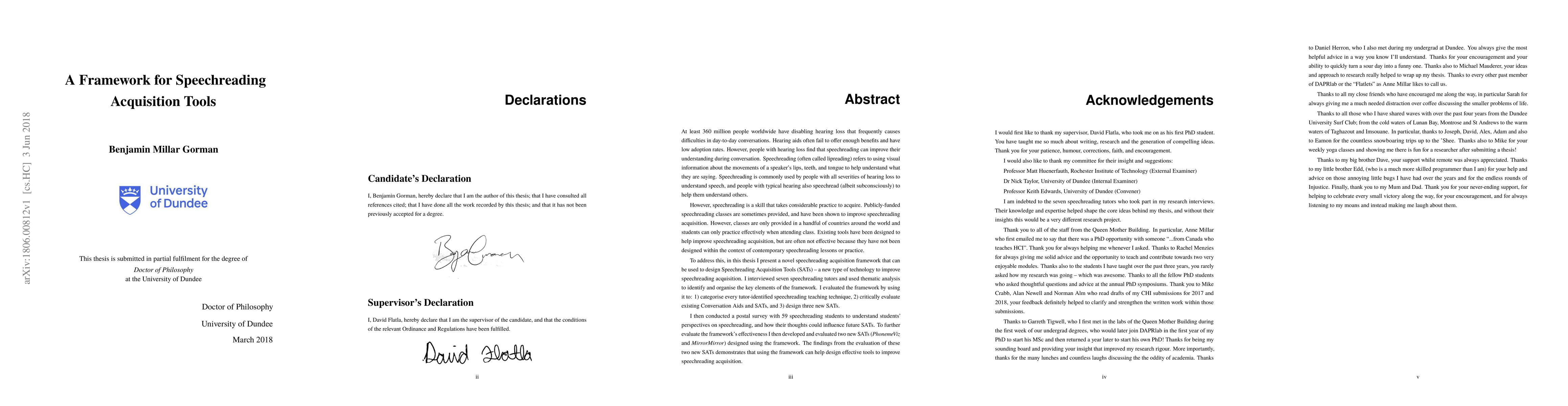 At least 360 million people worldwide have disabling hearing loss that frequently causes difficulties in day-to-day conversations. Hearing aids often fail to offer enough benefits and have low adoption rates. However, people with hearing loss find that speechreading can improve their understanding during conversation. Speechreading (often called lipreading) refers to using visual information about the movements of a speaker's lips, teeth, and tongue to help understand what they are saying. Speechreading is commonly used by people with all severities of hearing loss to understand speech, and people with typical hearing also speechread (albeit subconsciously) to help them understand others. However, speechreading is a skill that takes considerable practice to acquire. Publicly-funded speechreading classes are sometimes provided, and have been shown to improve speechreading acquisition. However, classes are only provided in a handful of countries around the world and students can only practice effectively when attending class. Existing tools have been designed to help improve speechreading acquisition, but are often not effective because they have not been designed within the context of contemporary speechreading lessons or practice. To address this, in this thesis I present a novel speechreading acquisition framework that can be used to design Speechreading Acquisition Tools (SATs) - a new type of technology to improve speechreading acquisition.