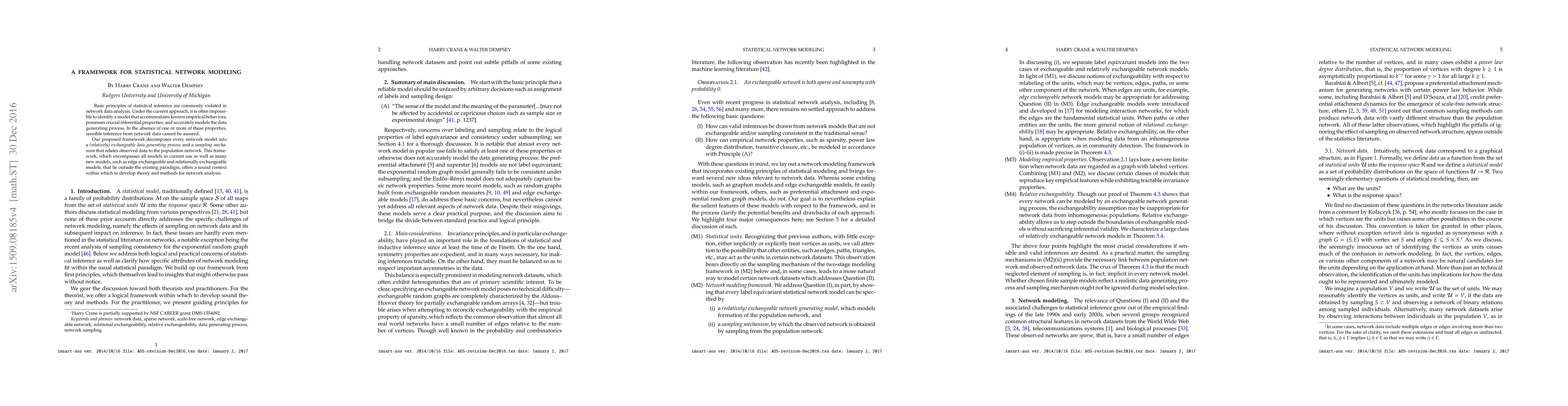 Basic principles of statistical inference are commonly violated in network data analysis. Under the current approach, it is often impossible to identify a model that accommodates known empirical behaviors, possesses crucial inferential properties, and accurately models the data generating process. In the absence of one or more of these properties, sensible inference from network data cannot be assured. Our proposed framework decomposes every network model into a (relatively) exchangeable data generating process} and a sampling mechanism that relates observed data to the population network. This framework, which encompasses all models in current use as well as many new models, such as edge exchangeable and relationally exchangeable models, that lie outside the existing paradigm, offers a sound context within which to develop theory and methods for network analysis.