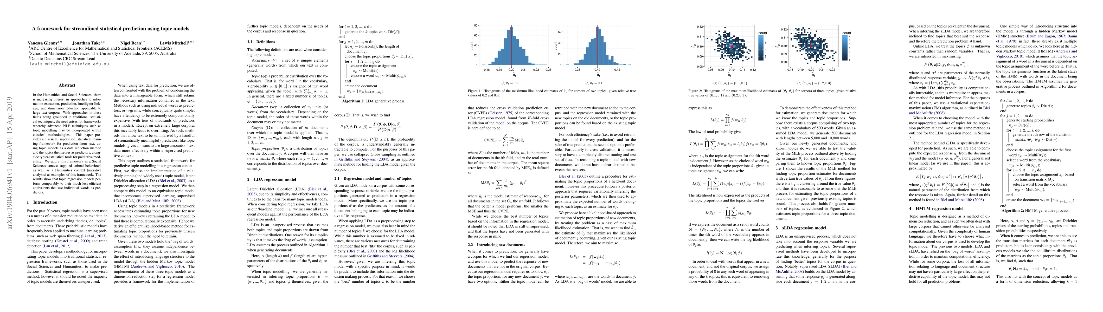 In the Humanities and Social Sciences, there is increasing interest in approaches to information extraction, prediction, intelligent linkage, and dimension reduction applicable to large text corpora. With approaches in these fields being grounded in traditional statistical techniques, the need arises for frameworks whereby advanced NLP techniques such as topic modelling may be incorporated within classical methodologies. This paper provides a classical, supervised, statistical learning framework for prediction from text, using topic models as a data reduction method and the topics themselves as predictors, alongside typical statistical tools for predictive modelling. We apply this framework in a Social Sciences context (applied animal behaviour) as well as a Humanities context (narrative analysis) as examples of this framework. The results show that topic regression models perform comparably to their much less efficient equivalents that use individual words as predictors.