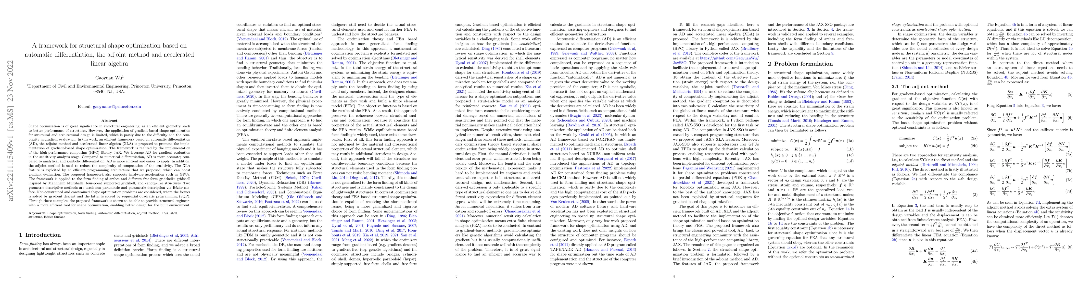 This paper proposes an efficient framework for structural shape optimization using automatic differentiation, the adjoint method, and accelerated linear algebra via the JAX library. The framework enhances gradient evaluation and supports hardware acceleration, enabling better design solutions for architectural structures.