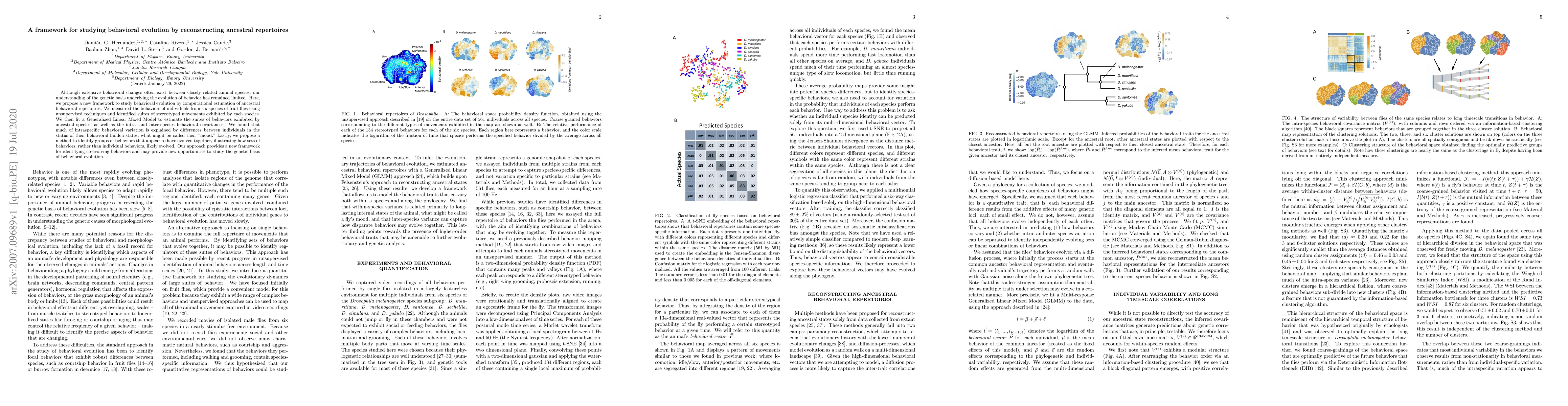 Although extensive behavioral changes often exist between closely related animal species, our understanding of the genetic basis underlying the evolution of behavior has remained limited. Here, we propose a new framework to study behavioral evolution by computational estimation of ancestral behavioral repertoires. We measured the behaviors of individuals from six species of fruit flies using unsupervised techniques and identified suites of stereotyped movements exhibited by each species. We then fit a Generalized Linear Mixed Model to estimate the suites of behaviors exhibited by ancestral species, as well as the intra- and inter-species behavioral covariances. We found that much of intraspecific behavioral variation is explained by differences between individuals in the status of their behavioral hidden states, what might be called their "mood." Lastly, we propose a method to identify groups of behaviors that appear to have evolved together, illustrating how sets of behaviors, rather than individual behaviors, likely evolved. Our approach provides a new framework for identifying co-evolving behaviors and may provide new opportunities to study the genetic basis of behavioral evolution.