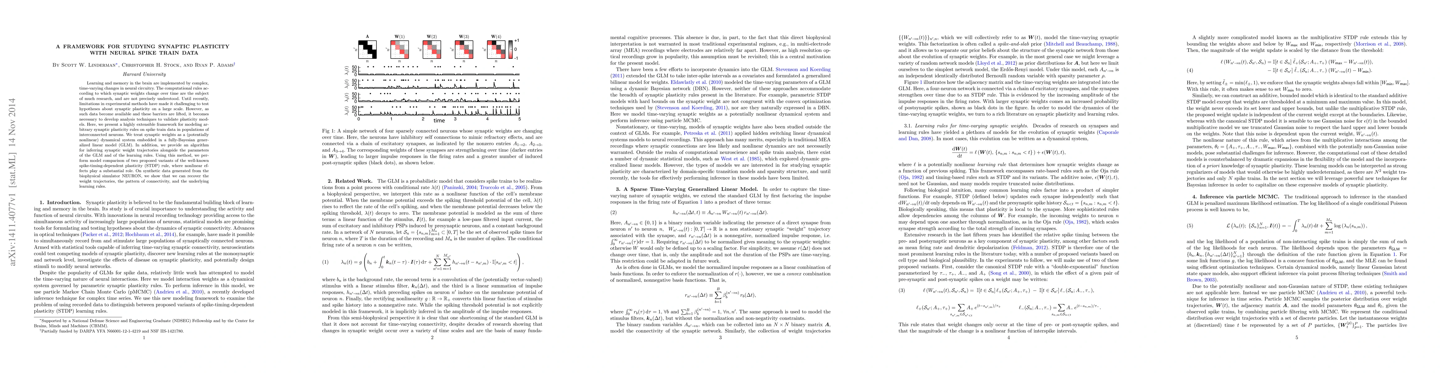 This paper introduces a framework for modeling synaptic plasticity using neural spike train data, employing a Bayesian generalized linear model to infer synaptic weight changes. The authors demonstrate the framework's effectiveness by comparing two variants of spike-timing-dependent plasticity rules on synthetic data.
