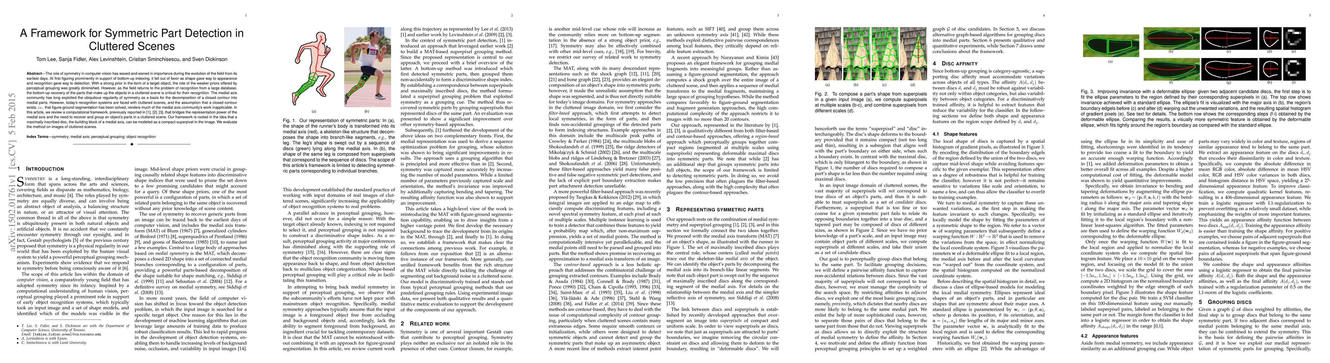The role of symmetry in computer vision has waxed and waned in importance during the evolution of the field from its earliest days. At first figuring prominently in support of bottom-up indexing, it fell out of favor as shape gave way to appearance and recognition gave way to detection. With a strong prior in the form of a target object, the role of the weaker priors offered by perceptual grouping was greatly diminished. However, as the field returns to the problem of recognition from a large database, the bottom-up recovery of the parts that make up the objects in a cluttered scene is critical for their recognition. The medial axis community has long exploited the ubiquitous regularity of symmetry as a basis for the decomposition of a closed contour into medial parts. However, today's recognition systems are faced with cluttered scenes, and the assumption that a closed contour exists, i.e. that figure-ground segmentation has been solved, renders much of the medial axis community's work inapplicable. In this article, we review a computational framework, previously reported in Lee et al. (2013), Levinshtein et al. (2009, 2013), that bridges the representation power of the medial axis and the need to recover and group an object's parts in a cluttered scene. Our framework is rooted in the idea that a maximally inscribed disc, the building block of a medial axis, can be modeled as a compact superpixel in the image. We evaluate the method on images of cluttered scenes.