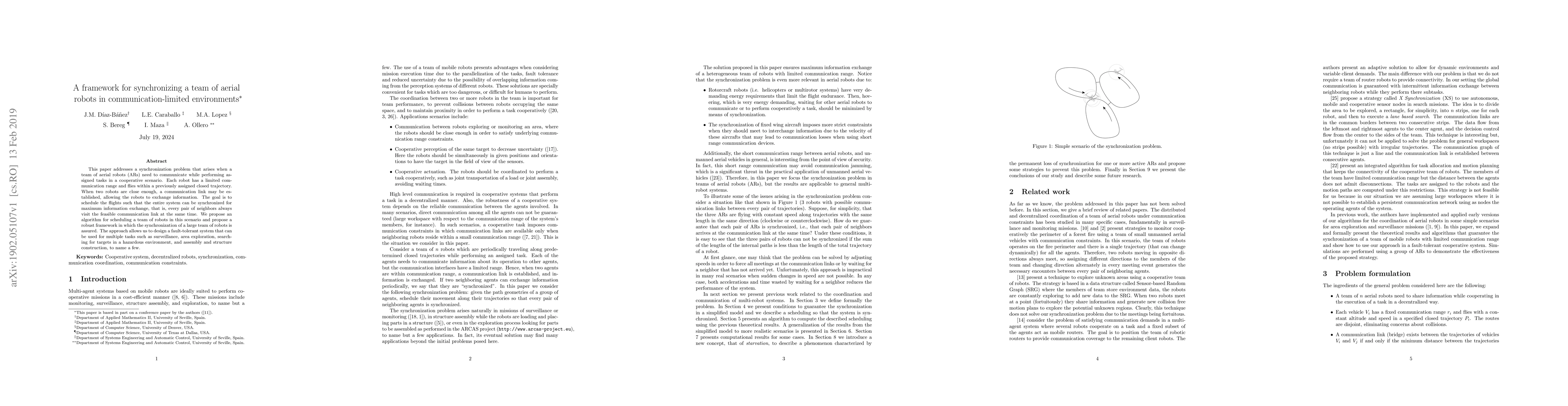 This paper addresses a synchronization problem that arises when a team of aerial robots (ARs) need to communicate while performing assigned tasks in a cooperative scenario. Each robot has a limited communication range and flies within a previously assigned closed trajectory. When two robots are close enough, a communication link may be established, allowing the robots to exchange information. The goal is to schedule the flights such that the entire system can be synchronized for maximum information exchange, that is, every pair of neighbors always visit the feasible communication link at the same time. We propose an algorithm for scheduling a team of robots in this scenario and propose a robust framework in which the synchronization of a large team of robots is assured. The approach allows us to design a fault-tolerant system that can be used for multiple tasks such as surveillance, area exploration, searching for targets in a hazardous environment, and assembly and structure construction, to name a few.