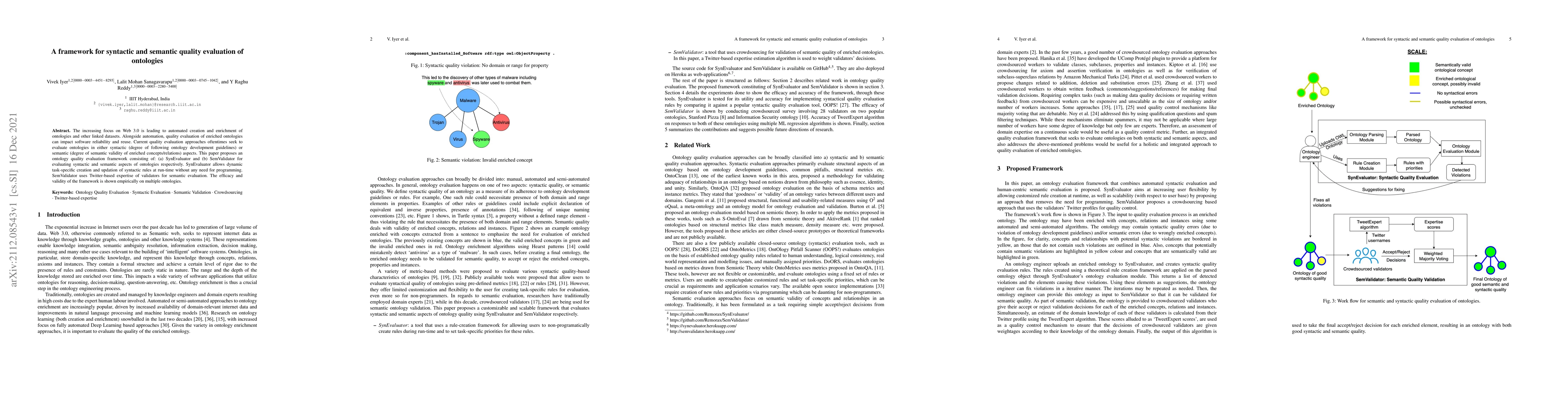 The increasing focus on Web 3.0 is leading to automated creation and enrichment of ontologies and other linked datasets. Alongside automation, quality evaluation of enriched ontologies can impact software reliability and reuse. Current quality evaluation approaches oftentimes seek to evaluate ontologies in either syntactic (degree of following ontology development guidelines) or semantic (degree of semantic validity of enriched concepts/relations) aspects. This paper proposes an ontology quality evaluation framework consisting of: (a) SynEvaluator and (b) SemValidator for evaluating syntactic and semantic aspects of ontologies respectively. SynEvaluator allows dynamic task-specific creation and updation of syntactic rules at run-time without any need for programming. SemValidator uses Twitter-based expertise of validators for semantic evaluation. The efficacy and validity of the framework is shown empirically on multiple ontologies.