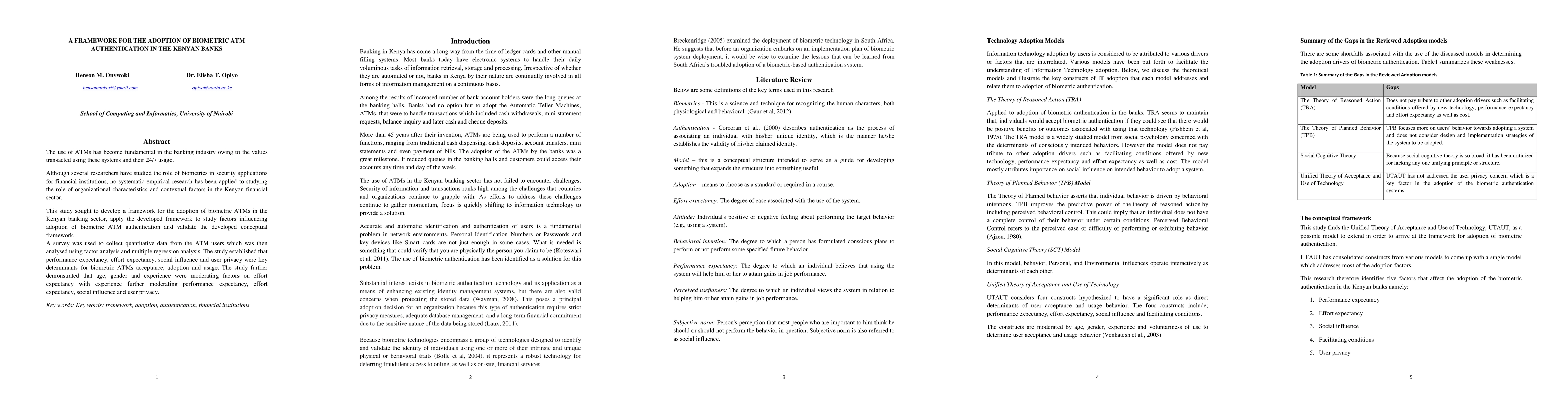 This study develops a framework for the adoption of biometric ATMs in Kenyan banks, identifying performance expectancy, effort expectancy, social influence, and user privacy as key determinants. It also highlights age, gender, and experience as moderating factors influencing adoption.