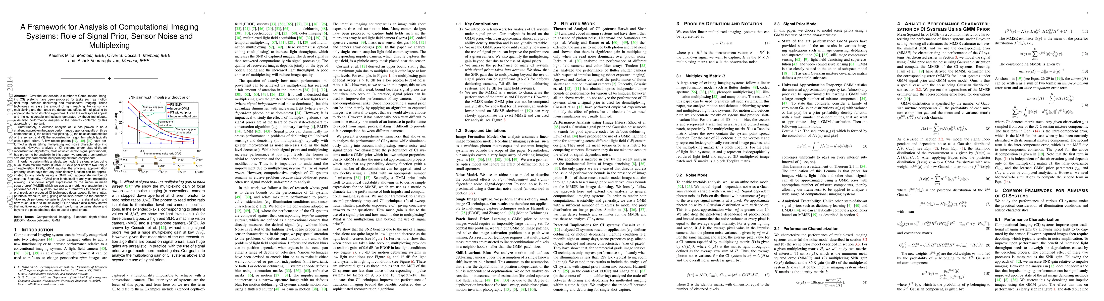 Over the last decade, a number of Computational Imaging (CI) systems have been proposed for tasks such as motion deblurring, defocus deblurring and multispectral imaging. These techniques increase the amount of light reaching the sensor via multiplexing and then undo the deleterious effects of multiplexing by appropriate reconstruction algorithms. Given the widespread appeal and the considerable enthusiasm generated by these techniques, a detailed performance analysis of the benefits conferred by this approach is important. Unfortunately, a detailed analysis of CI has proven to be a challenging problem because performance depends equally on three components: (1) the optical multiplexing, (2) the noise characteristics of the sensor, and (3) the reconstruction algorithm. A few recent papers have performed analysis taking multiplexing and noise characteristics into account. However, analysis of CI systems under state-of-the-art reconstruction algorithms, most of which exploit signal prior models, has proven to be unwieldy. In this paper, we present a comprehensive analysis framework incorporating all three components. In order to perform this analysis, we model the signal priors using a Gaussian Mixture Model (GMM). A GMM prior confers two unique characteristics. Firstly, GMM satisfies the universal approximation property which says that any prior density function can be approximated to any fidelity using a GMM with appropriate number of mixtures. Secondly, a GMM prior lends itself to analytical tractability allowing us to derive simple expressions for the `minimum mean square error' (MMSE), which we use as a metric to characterize the performance of CI systems. We use our framework to analyze several previously proposed CI techniques, giving conclusive answer to the question: `How much performance gain is due to use of a signal prior and how much is due to multiplexing?