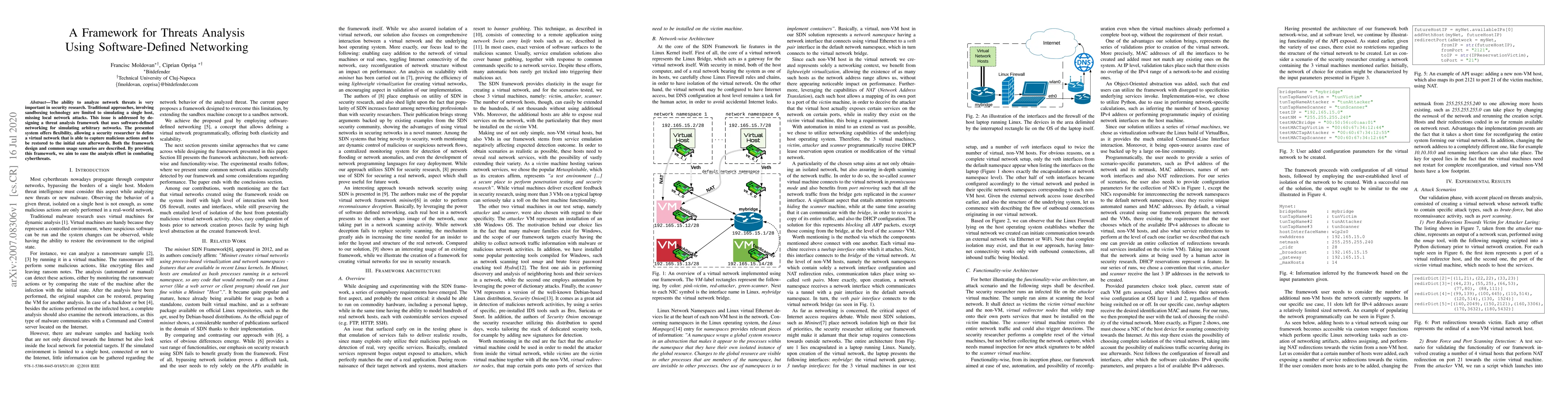 This paper presents a framework for analyzing network threats using software-defined networking, addressing limitations of traditional sandboxing by simulating arbitrary networks. The framework offers flexibility to define virtual networks for capturing malicious actions and restoring them post-analysis.