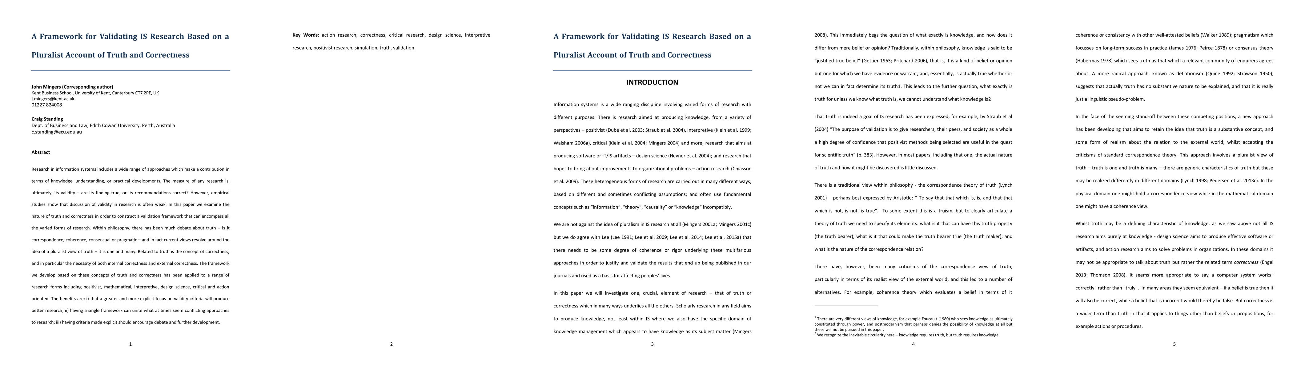 Research in information systems includes a wide range of approaches which make a contribution in terms of knowledge, understanding, or practical developments. The measure of any research is, ultimately, its validity: are its finding true, or its recommendations correct? However, empirical studies show that discussion of validity in research is often weak. In this paper we examine the nature of truth and correctness in order to construct a validation framework that can encompass all the varied forms of research. Within philosophy, there has been much debate about truth, is it correspondence, coherence, consensual or pragmatic, and in fact current views revolve around the idea of a pluralist view of truth: it is one and many. Related to truth is the concept of correctness, and in particular the necessity of both internal correctness and external correctness. The framework we develop based on these concepts of truth and correctness has been applied to a range of research forms including positivist, mathematical, interpretive, design science, critical and action oriented. The benefits are: i) that a greater and more explicit focus on validity criteria will produce better research; ii) having a single framework can unite what at times seem conflicting approaches to research; iii) having criteria made explicit should encourage debate and further development.