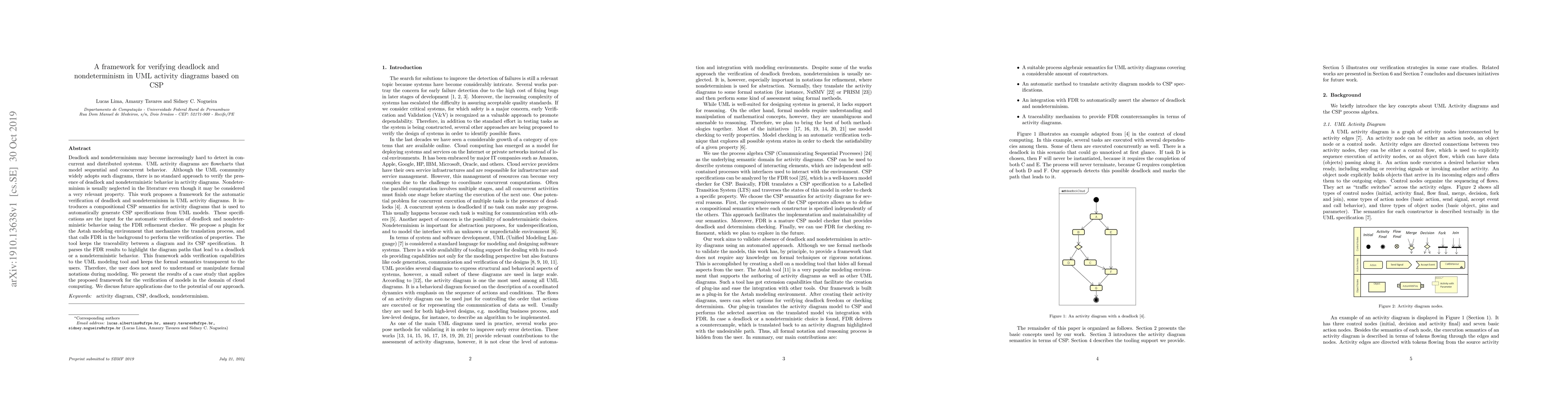 This paper proposes a framework for verifying deadlock and nondeterminism in UML activity diagrams using CSP semantics and the FDR refinement checker. It introduces a plugin for Astah that automates the translation of UML models to CSP specifications and performs verification, maintaining traceability and highlighting problematic paths.