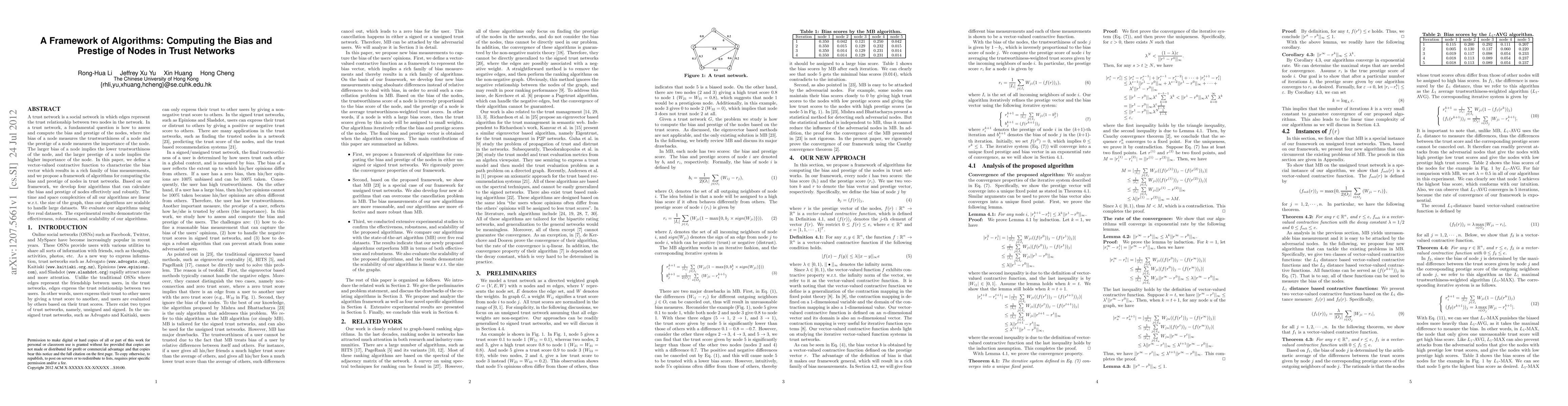 A trust network is a social network in which edges represent the trust relationship between two nodes in the network. In a trust network, a fundamental question is how to assess and compute the bias and prestige of the nodes, where the bias of a node measures the trustworthiness of a node and the prestige of a node measures the importance of the node. The larger bias of a node implies the lower trustworthiness of the node, and the larger prestige of a node implies the higher importance of the node. In this paper, we define a vector-valued contractive function to characterize the bias vector which results in a rich family of bias measurements, and we propose a framework of algorithms for computing the bias and prestige of nodes in trust networks. Based on our framework, we develop four algorithms that can calculate the bias and prestige of nodes effectively and robustly. The time and space complexities of all our algorithms are linear w.r.t. the size of the graph, thus our algorithms are scalable to handle large datasets. We evaluate our algorithms using five real datasets. The experimental results demonstrate the effectiveness, robustness, and scalability of our algorithms.