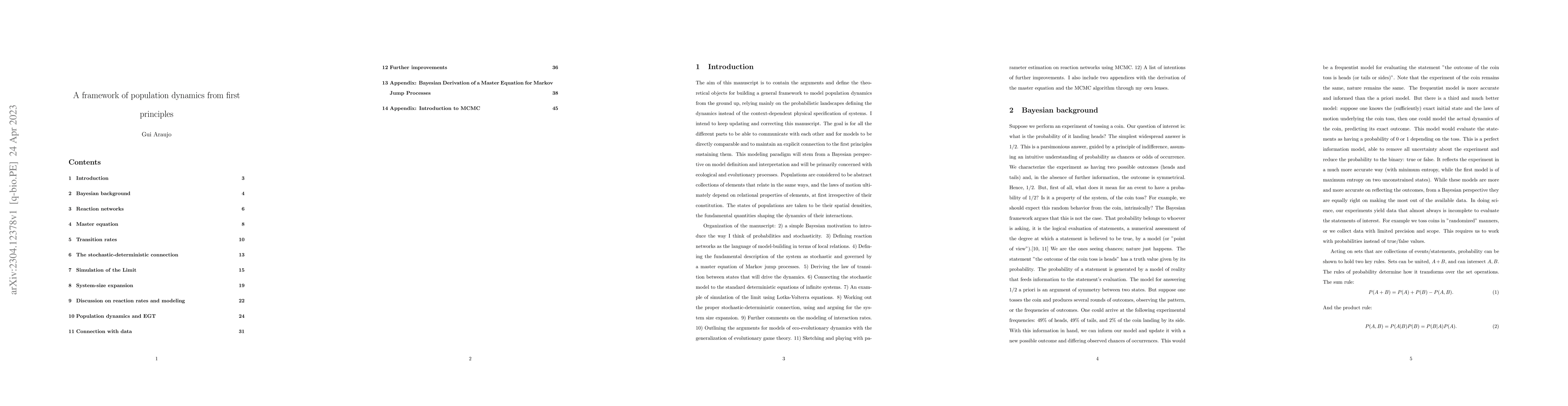 The aim of this manuscript is to contain the arguments and define the theoretical objects for building a general framework to model population dynamics from the ground up, relying mainly on the probabilistic landscapes defining the dynamics instead of the context-dependent physical specification of systems. I intend to keep updating and correcting this manuscript. The goal is for all the different parts to be able to communicate with each other and for models to be directly comparable and to maintain an explicit connection to the first principles sustaining them. This modeling paradigm will stem from a Bayesian perspective on model definition and interpretation and will be primarily concerned with ecological and evolutionary processes. Populations are considered to be abstract collections of elements that relate in the same ways, and the laws of motion ultimately depend on relational properties of elements, at first irrespective of their constitution. The states of populations are taken to be their spatial densities, the fundamental quantities shaping the dynamics of their interactions.