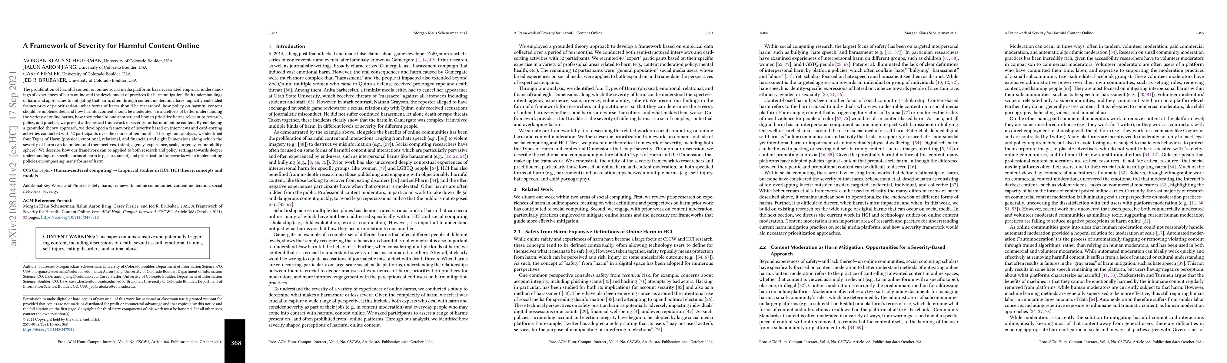 This paper presents a theoretical framework of severity for harmful online content, developed through grounded theory and interviews with 52 participants. The framework identifies four types of harm and eight dimensions to assess severity, aiding research and policy in understanding and prioritizing various forms of online harm.