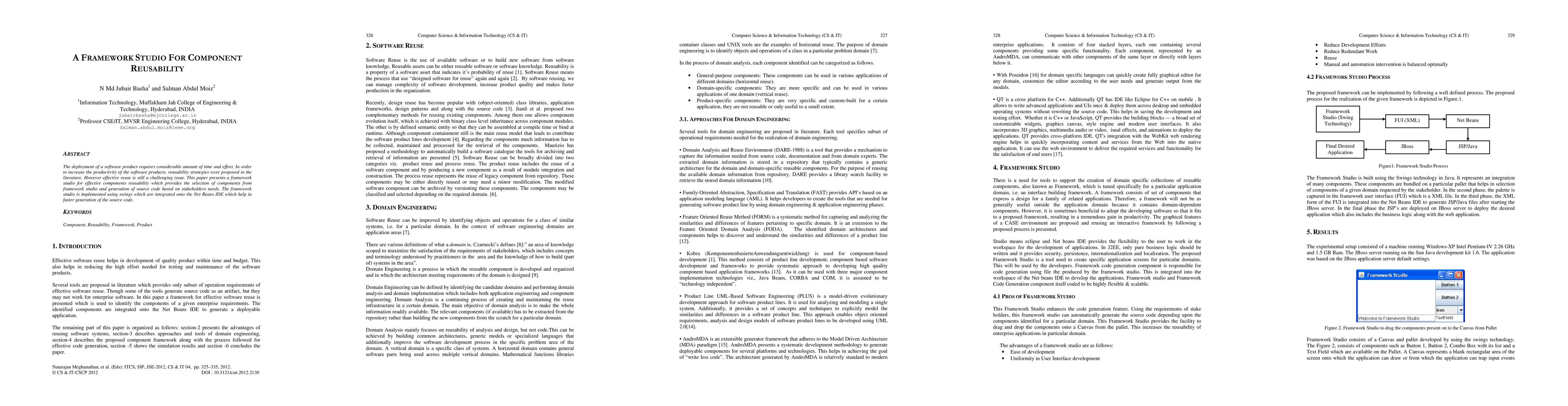This paper introduces a framework studio aimed at enhancing component reusability in software development, offering a tool for selecting components and generating source code tailored to stakeholder needs, implemented within the Net Beans IDE for improved efficiency.