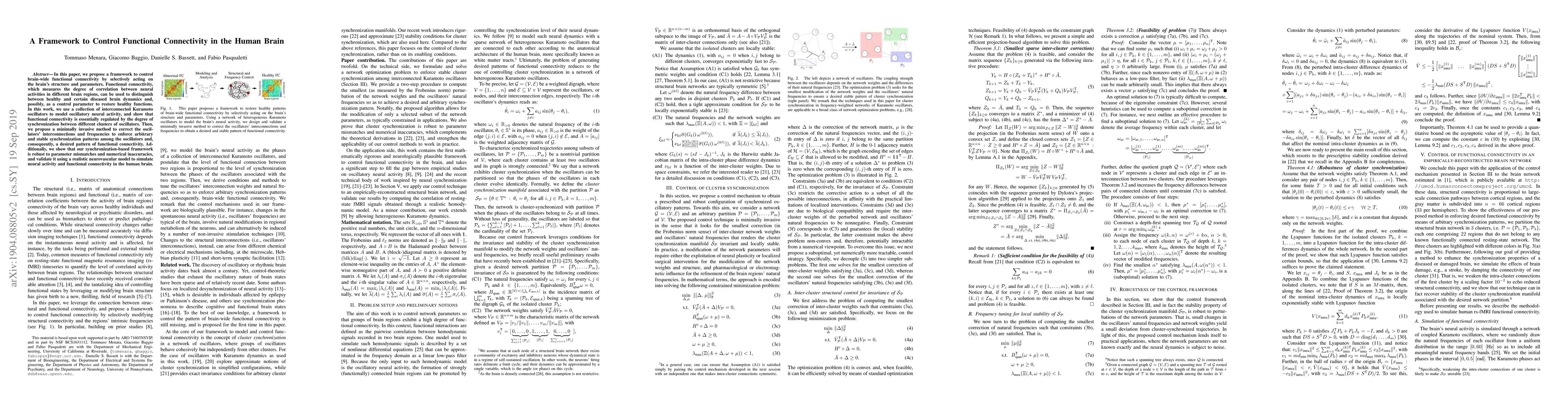 In this paper, we propose a framework to control brain-wide functional connectivity by selectively acting on the brain's structure and parameters. Functional connectivity, which measures the degree of correlation between neural activities in different brain regions, can be used to distinguish between healthy and certain diseased brain dynamics and, possibly, as a control parameter to restore healthy functions. In this work, we use a collection of interconnected Kuramoto oscillators to model oscillatory neural activity, and show that functional connectivity is essentially regulated by the degree of synchronization between different clusters of oscillators. Then, we propose a minimally invasive method to correct the oscillators' interconnections and frequencies to enforce arbitrary and stable synchronization patterns among the oscillators and, consequently, a desired pattern of functional connectivity. Additionally, we show that our synchronization-based framework is robust to parameter mismatches and numerical inaccuracies, and validate it using a realistic neurovascular model to simulate neural activity and functional connectivity in the human brain.