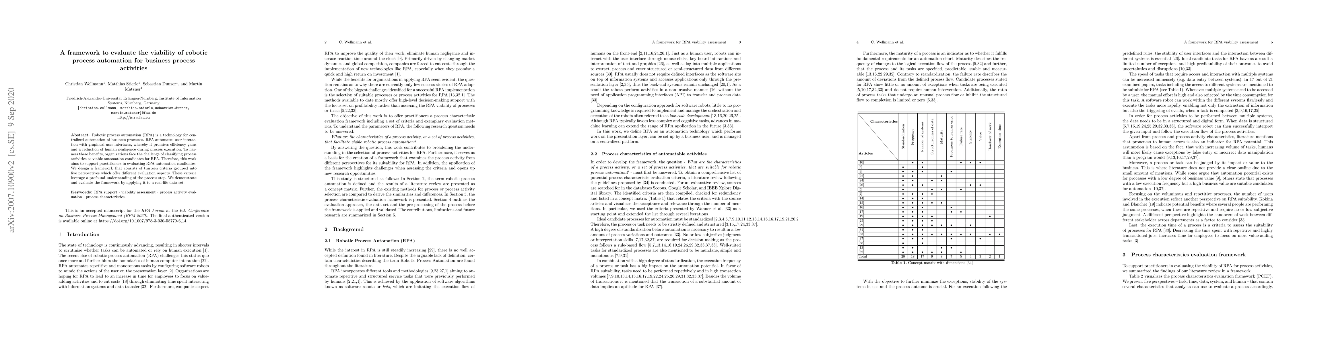 This paper presents a framework with thirteen criteria grouped into five perspectives to evaluate the viability of robotic process automation (RPA) for business process activities, aiming to assist practitioners in identifying suitable automation candidates. The framework is demonstrated and evaluated using a real-life dataset.