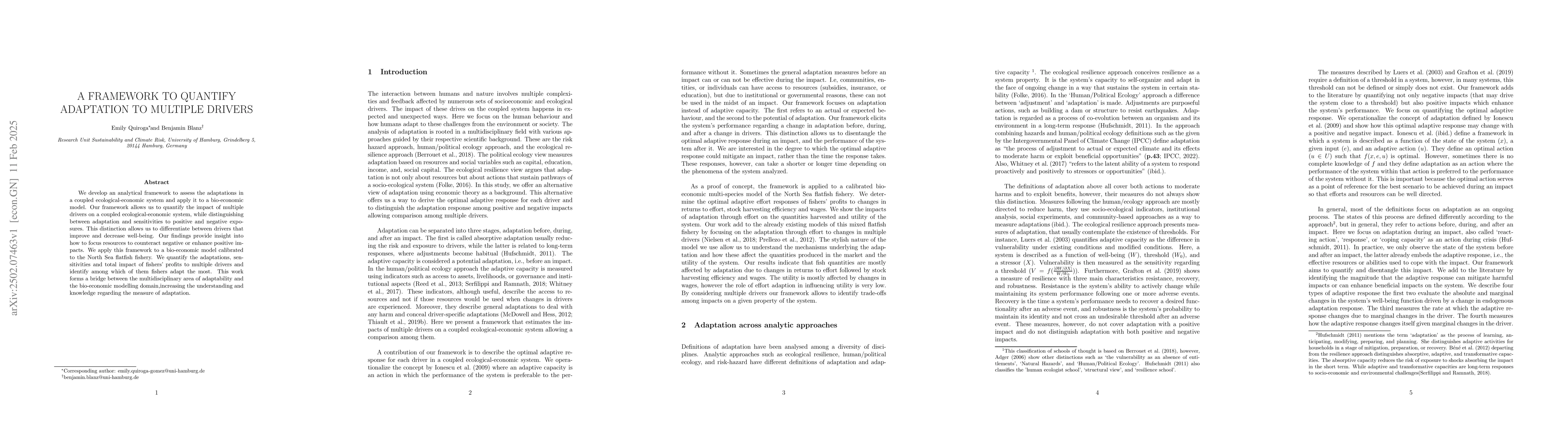 This paper introduces a framework to quantify adaptation in coupled ecological-economic systems, distinguishing between adaptation and sensitivity to various drivers. Applied to the North Sea flatfish fishery, it reveals how fishers adapt to multiple influences, providing insights for resource allocation to mitigate negative and enhance positive impacts.