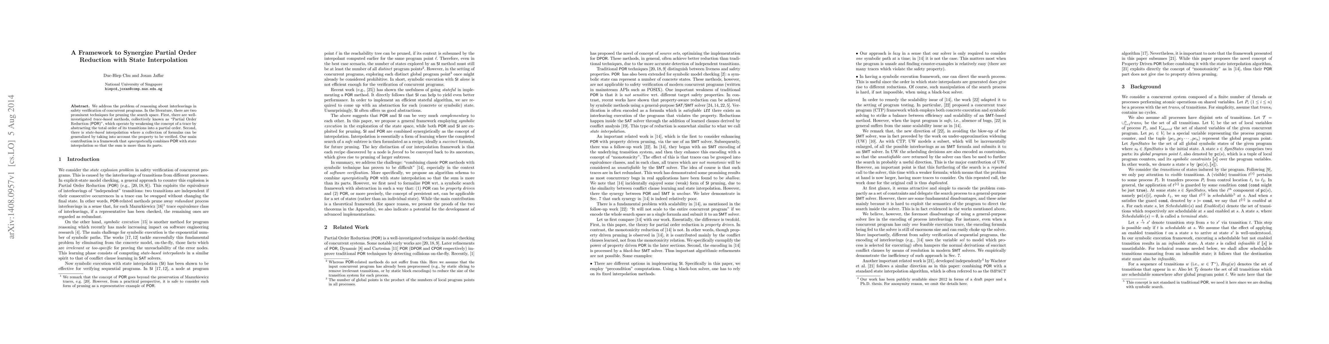 This paper proposes a framework that integrates Partial Order Reduction (POR) with state interpolation to enhance the efficiency of safety verification for concurrent programs. The synergy aims to reduce the search space more effectively than using either technique alone.