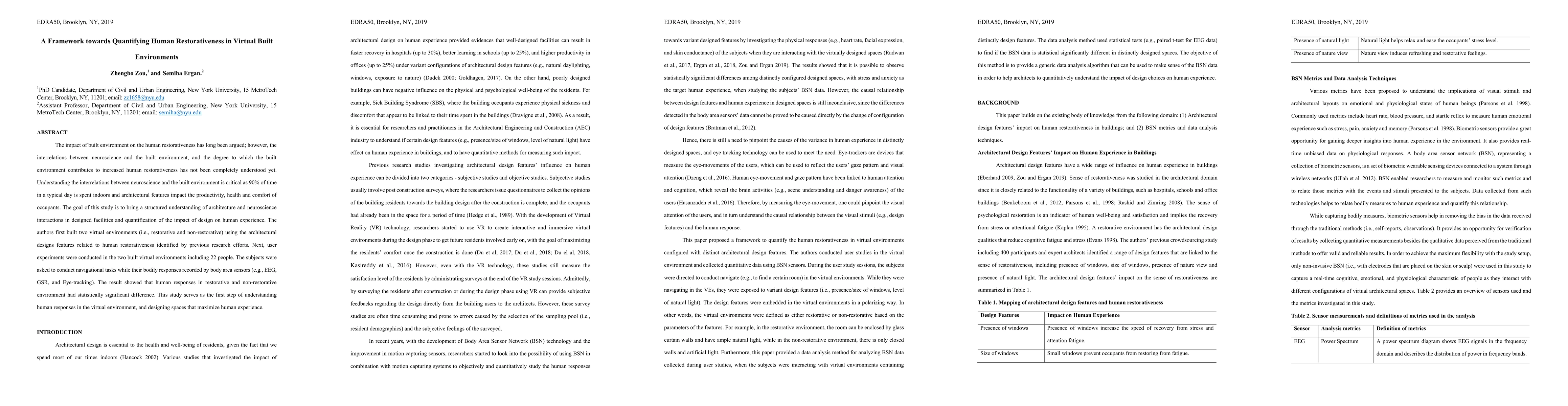 The impact of built environment on the human restorativeness has long been argued; however, the interrelations between neuroscience and the built environment, and the degree to which the built environment contributes to increased human restorativeness has not been completely understood yet. Understanding the interrelations between neuroscience and the built environment is critical as 90% of time in a typical day is spent indoors and architectural features impact the productivity, health and comfort of occupants. The goal of this study is to bring a structured understanding of architecture and neuroscience interactions in designed facilities and quantification of the impact of design on human experience. The authors first built two virtual environments (i.e., restorative and non-restorative) using the architectural designs features related to human restorativeness identified by previous research efforts. Next, user experiments were conducted in the two built virtual environments including 22 people. The subjects were asked to conduct navigational tasks while their bodily responses recorded by body area sensors (e.g., EEG, GSR, and Eye-tracking). The result showed that human responses in restorative and non-restorative environment had statistically significant difference. This study serves as the first step of understanding human responses in the virtual environment, and designing spaces that maximize human experience.